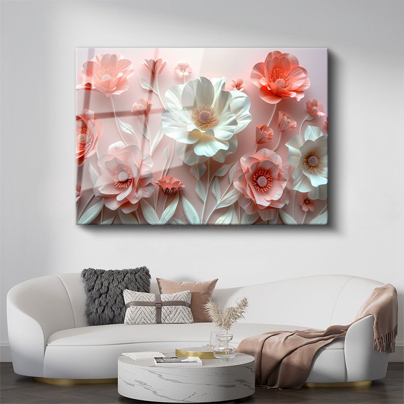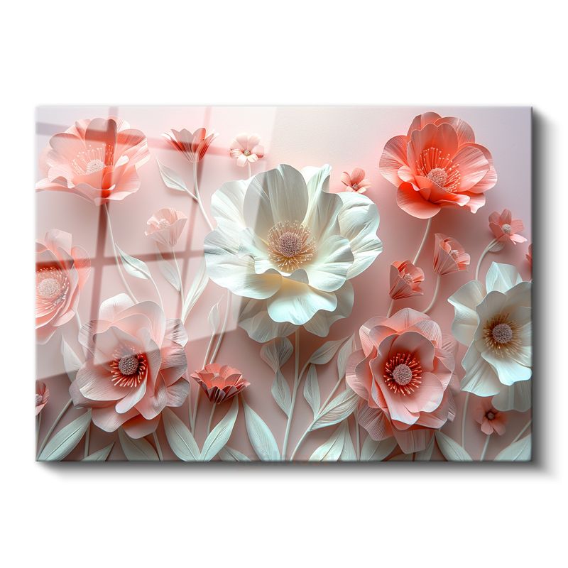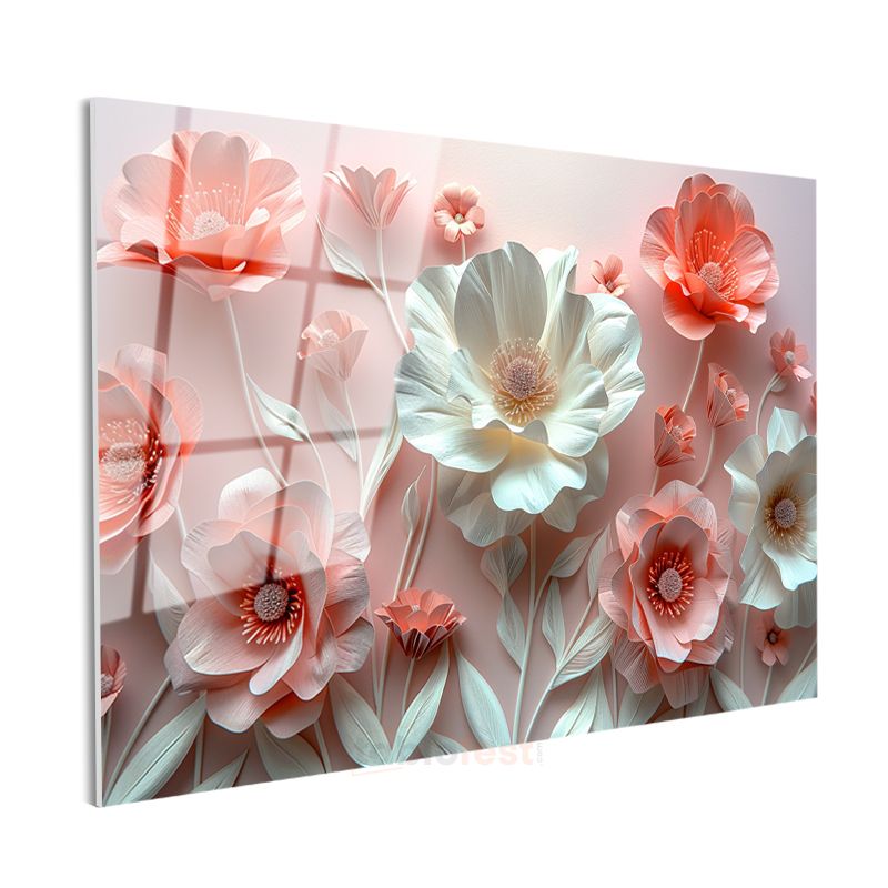 3D Çiçekler - Pembe ve Beyaz Kağıt Sanatı Kompozisyonu Cam Tablo