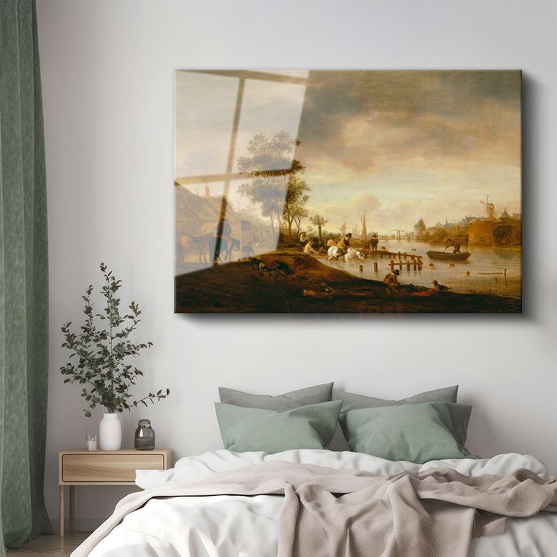 Aelbert Cuyp - Nehir Kıyısında Günbatımı Cam Tablo