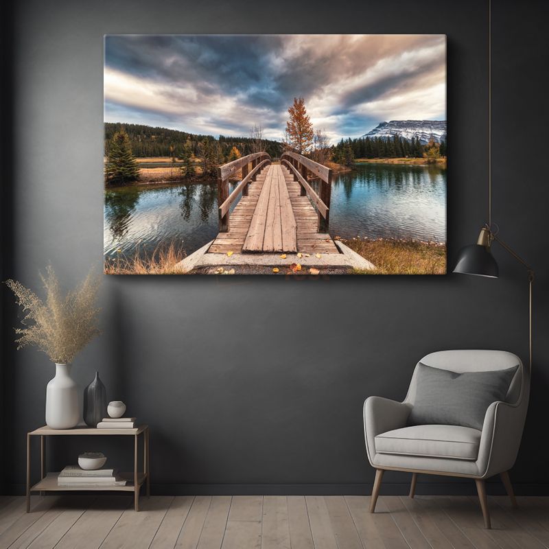 Ahşap Köprü - Sonbahar Göl Manzarası Kanvas Tablo