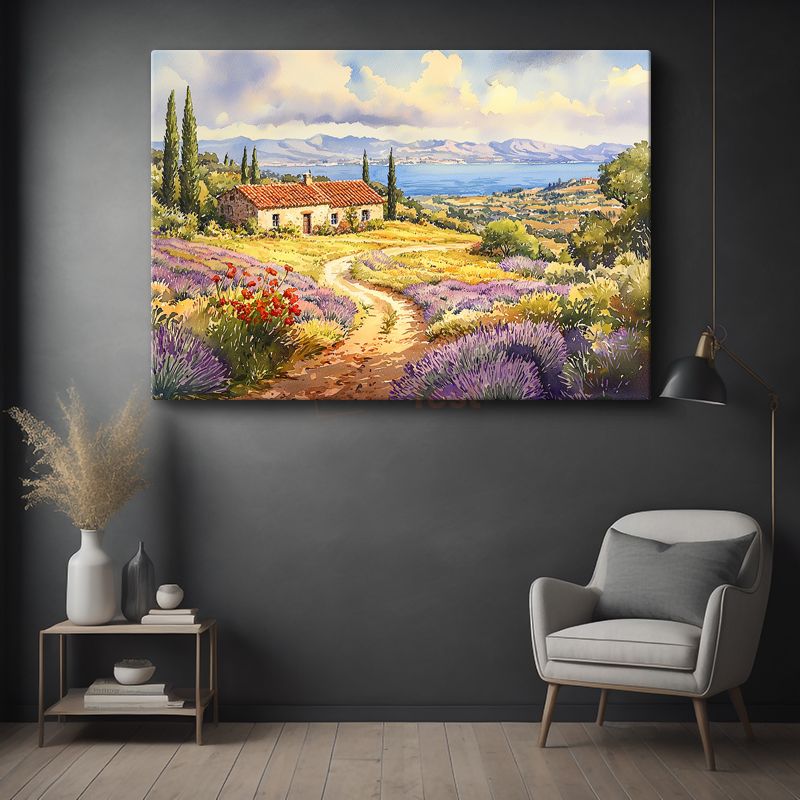 Akdeniz Çiftliği - Lavanta Tarlaları ve Deniz Manzaralı Kır Evi Kanvas Tablo