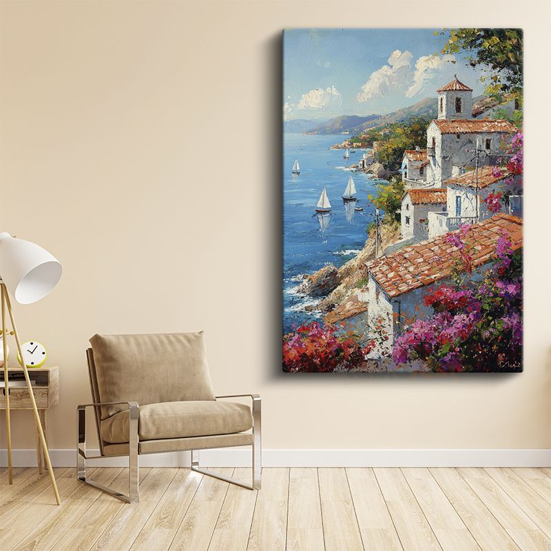 Akdeniz Kıyısı - Beyaz Evler ve Çiçekli Sokaklar Kanvas Tablo
