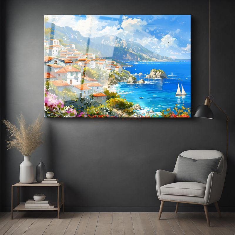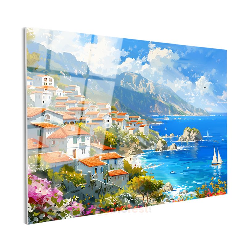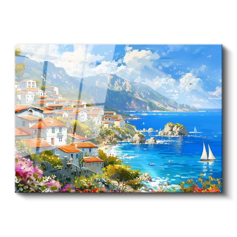 Akdeniz Kıyısı - Beyaz Evler ve Mavi Deniz Cam Tablo