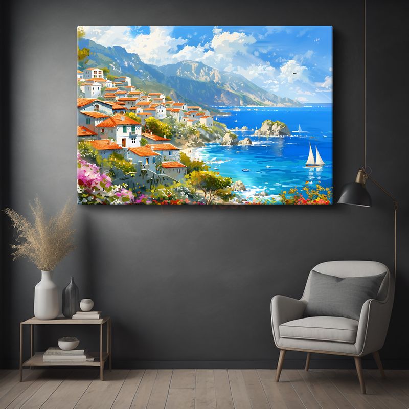 Akdeniz Kıyısı - Beyaz Evler ve Mavi Deniz Kanvas Tablo