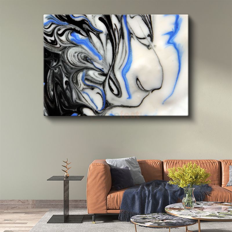 Akışkan Simetri - Siyah Beyaz Mavi Mermerleme Kanvas Tablo