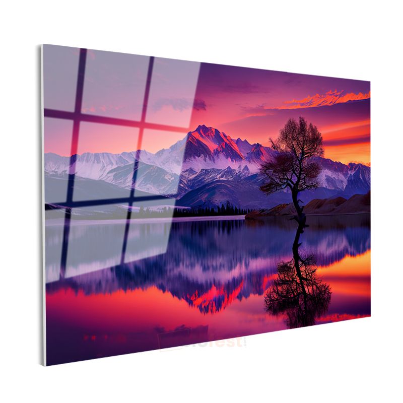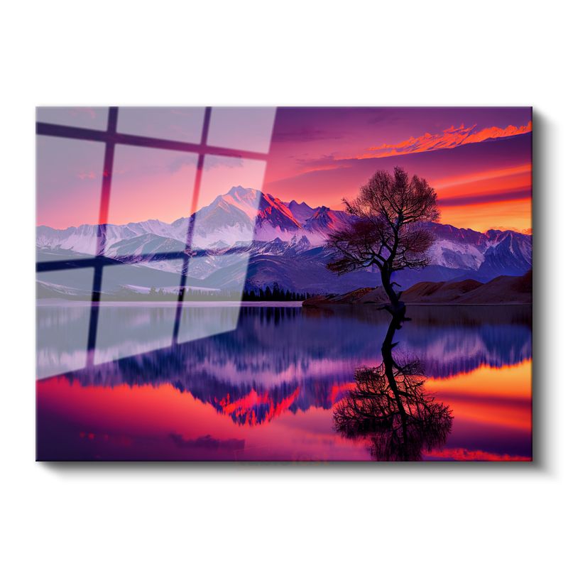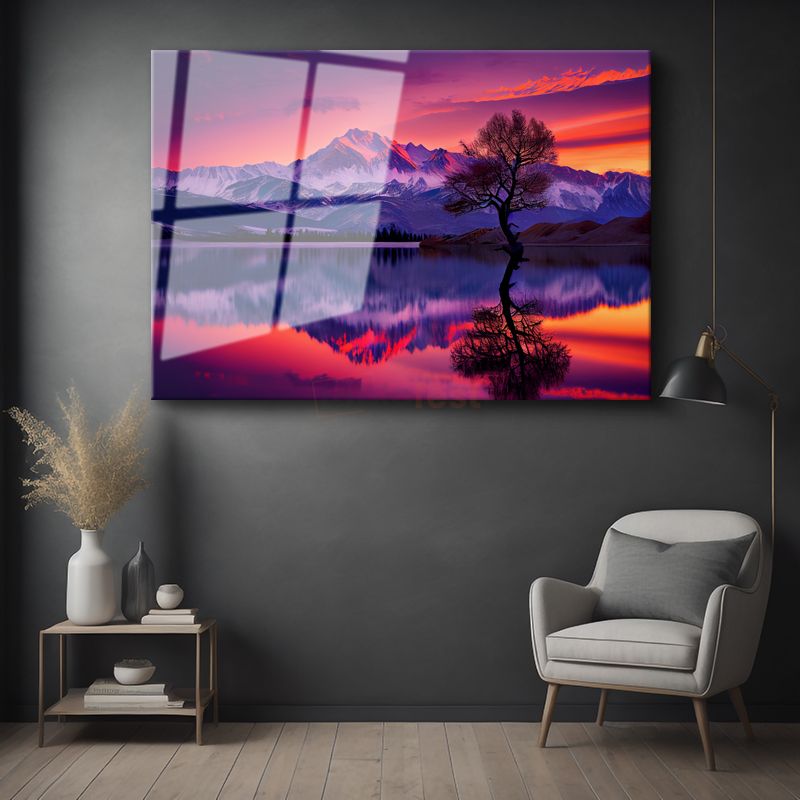 Alacakaranlık Dağları - Mor Gökyüzü Altında Yalnız Ağaç Cam Tablo