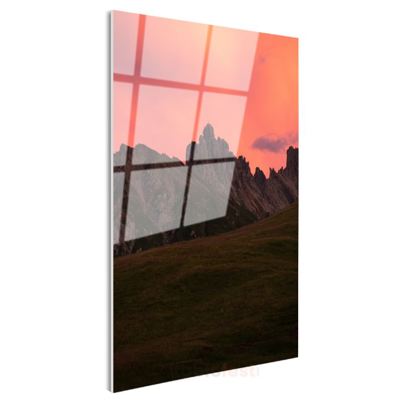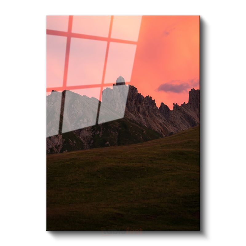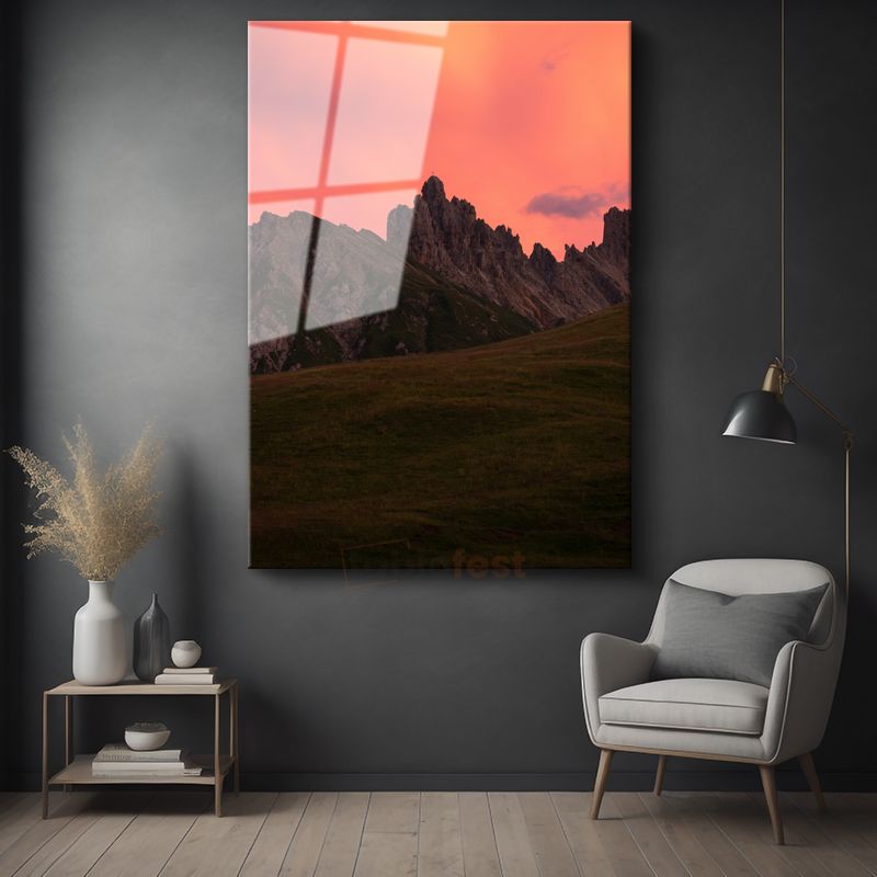 Alacakaranlık Dağları - Pembe Gökyüzü Altında Yükselen Kayalıklar Cam Tablo