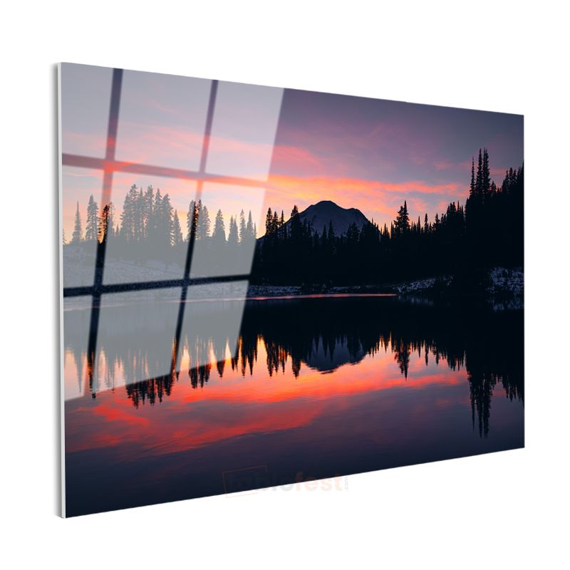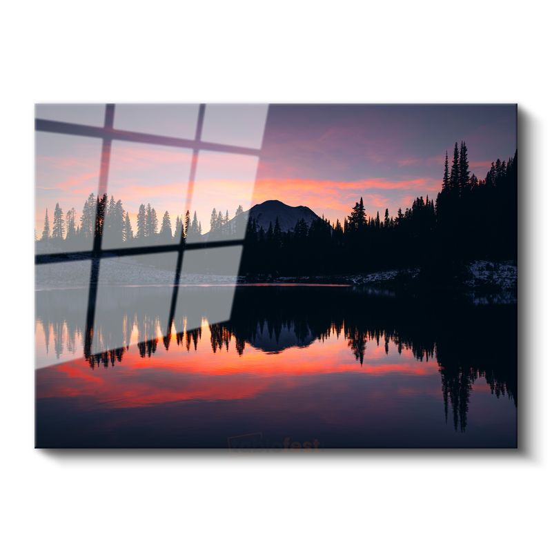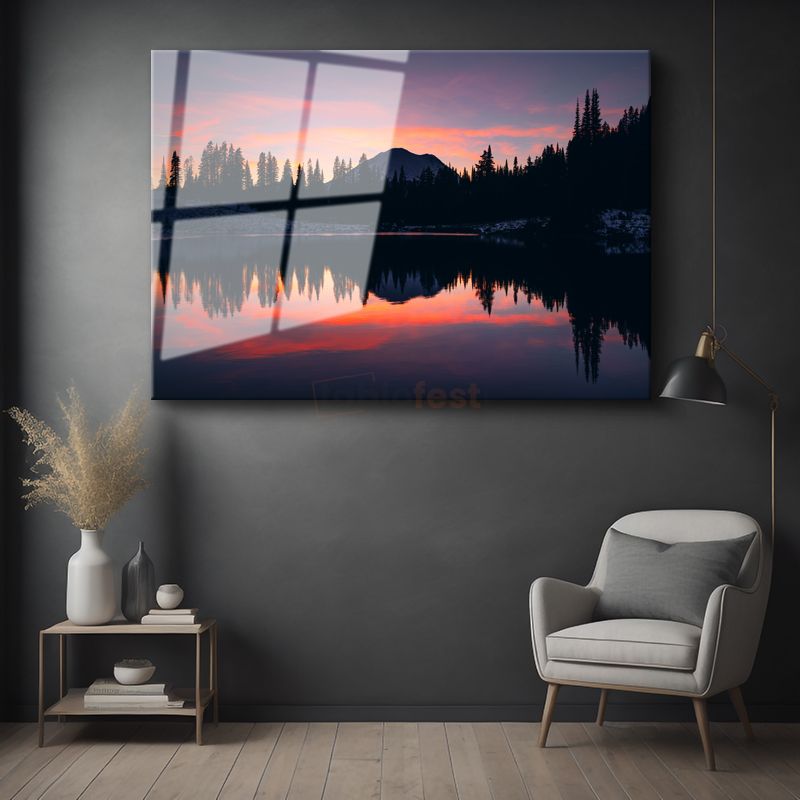Alacakaranlık Gölü - Dağ Silüetli Yansıma Cam Tablo