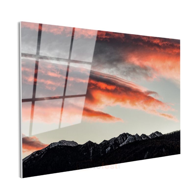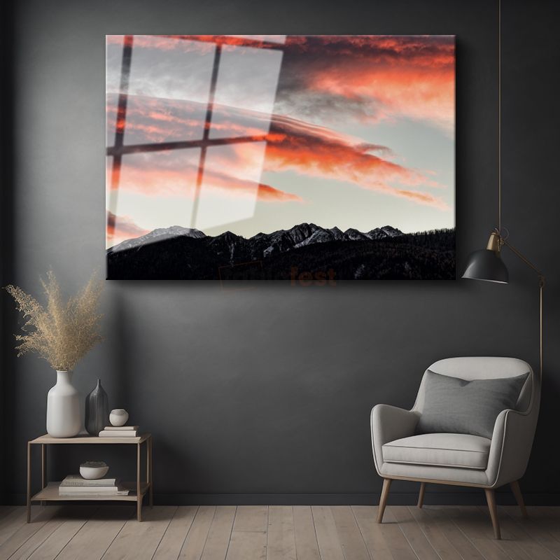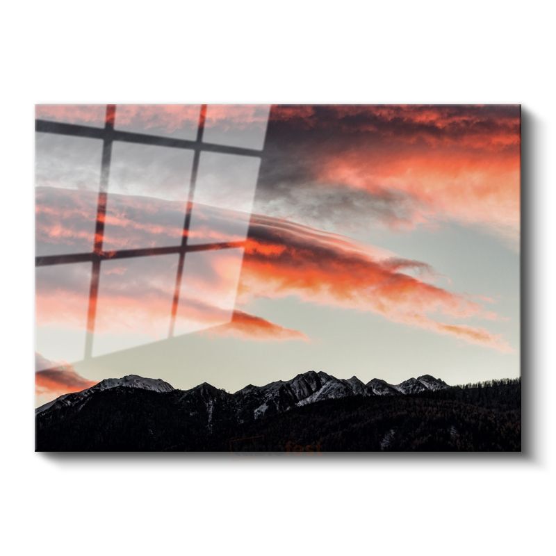 Alacakaranlık Zirveler - Kızıl Gökyüzü Altında Dağlar Cam Tablo