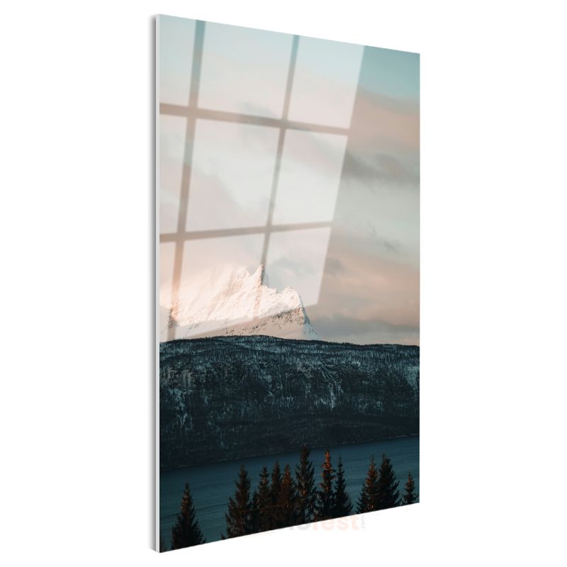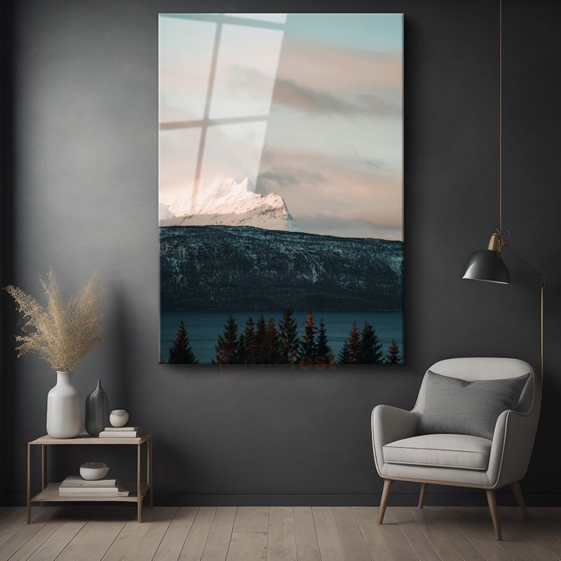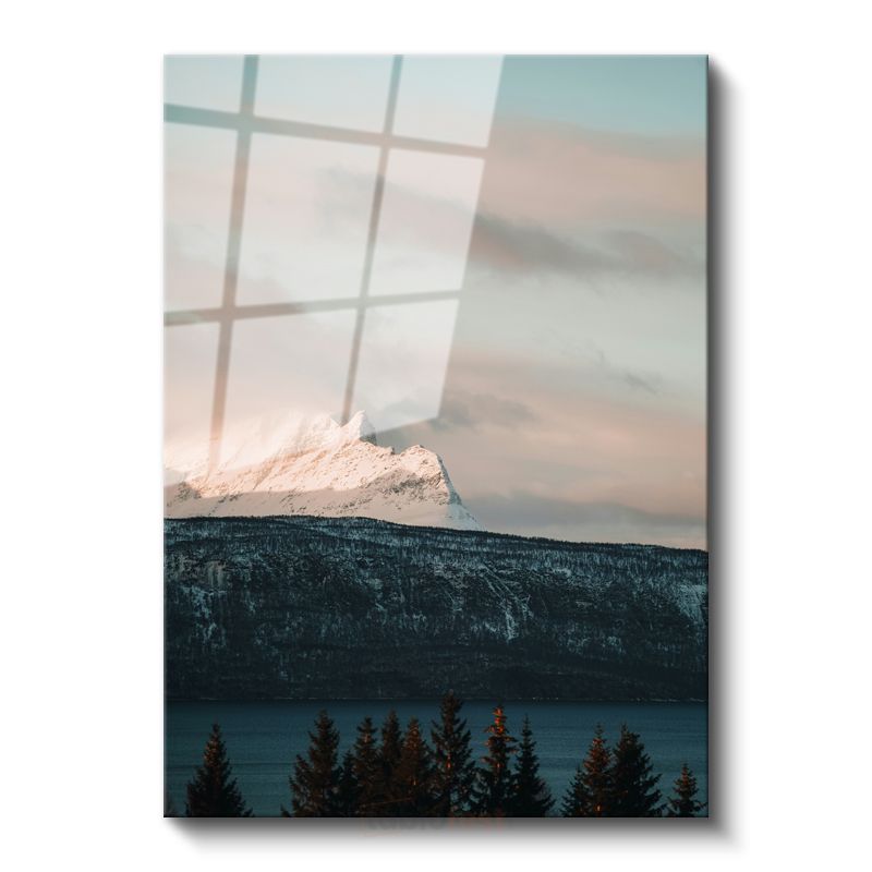 Alacakaranlık Zirvesi - Karlı Dağ ve Göl Manzarası Cam Tablo