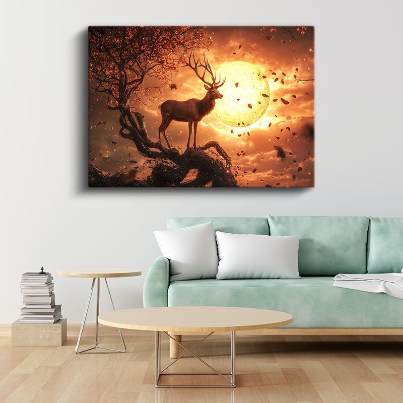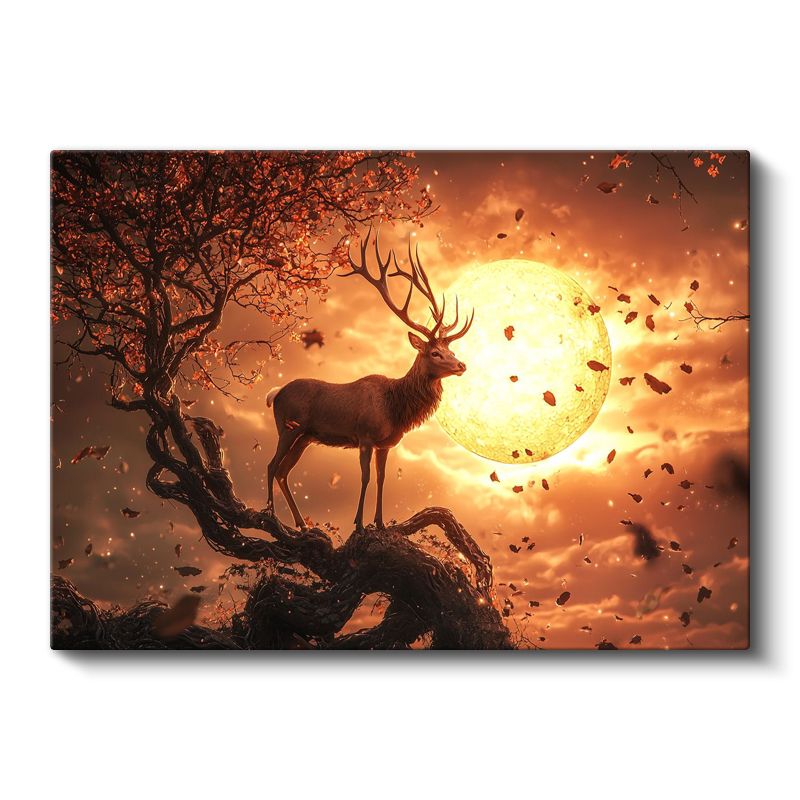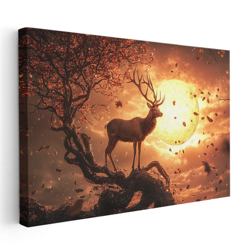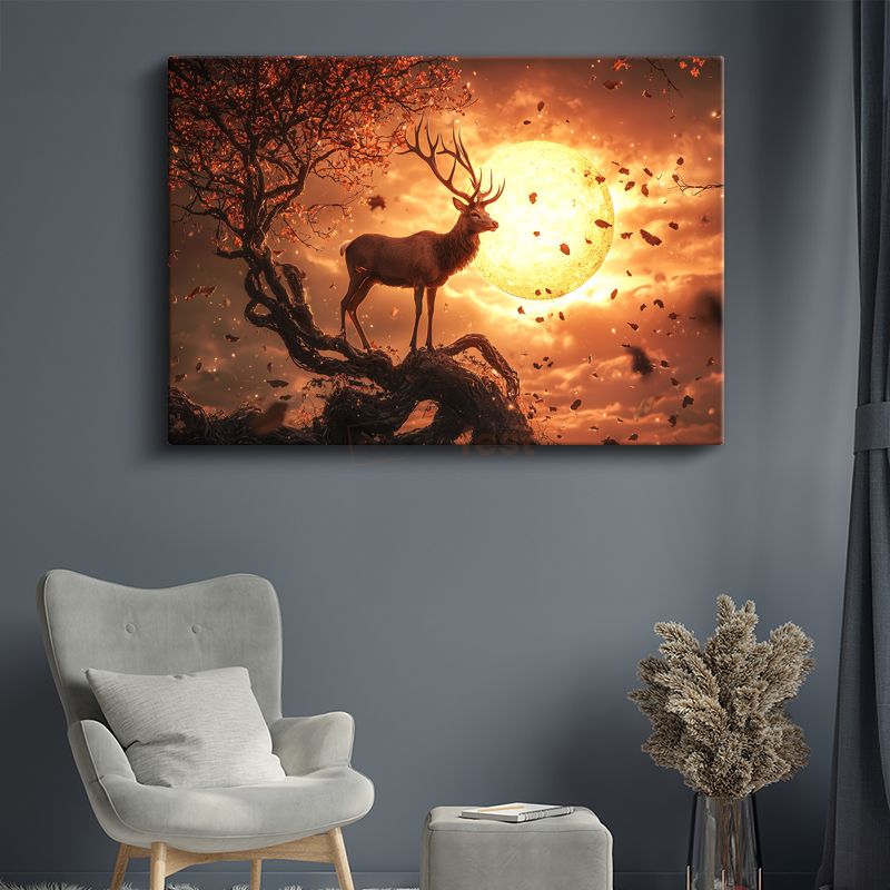 Alev Ay - Gün Batımında Ağaç Üzerindeki Asil Geyik Kanvas Tablo