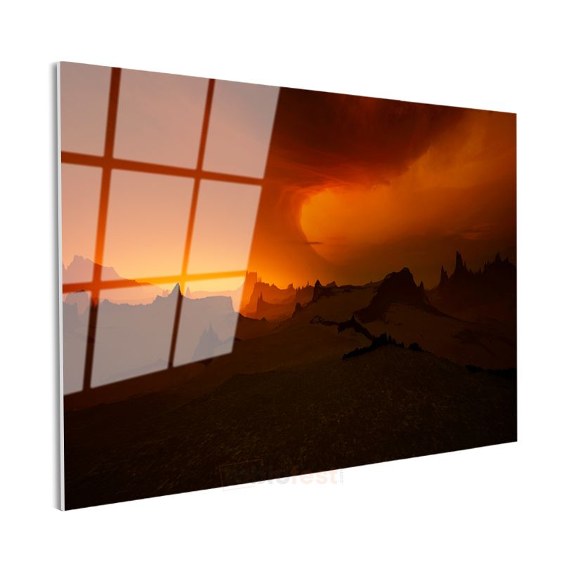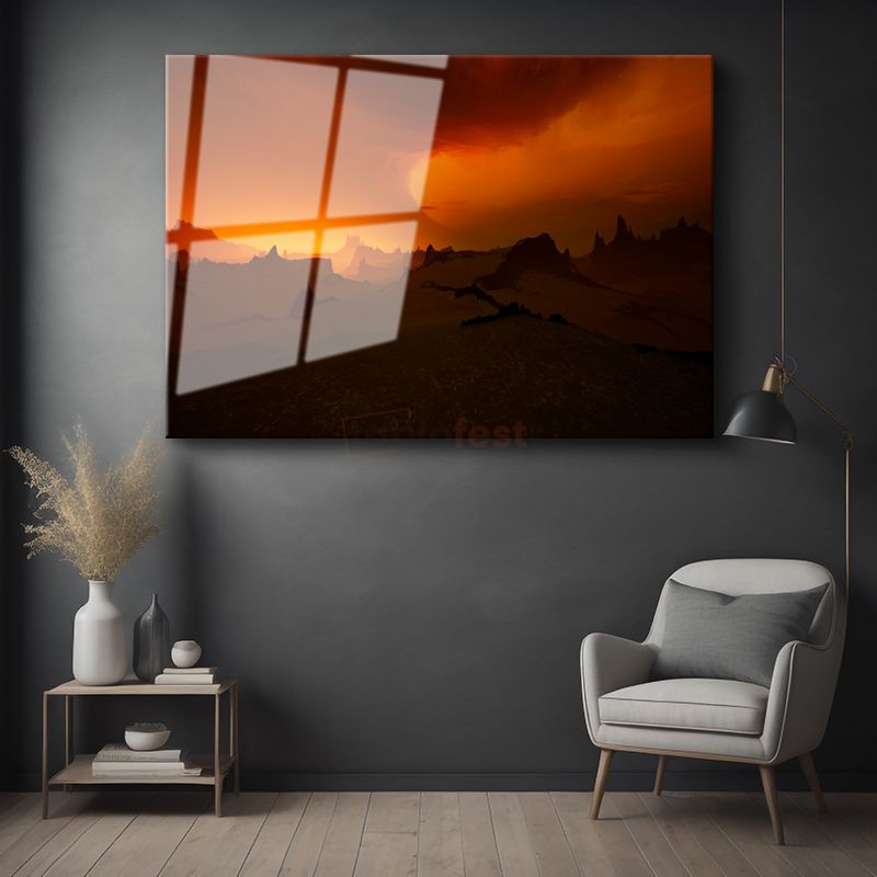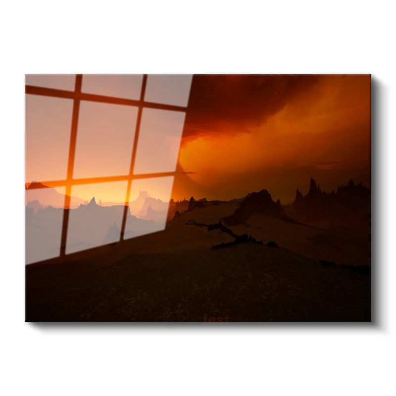 Alev Dağları - Kızıl Gökyüzü ve Dramatik Silüetler Cam Tablo
