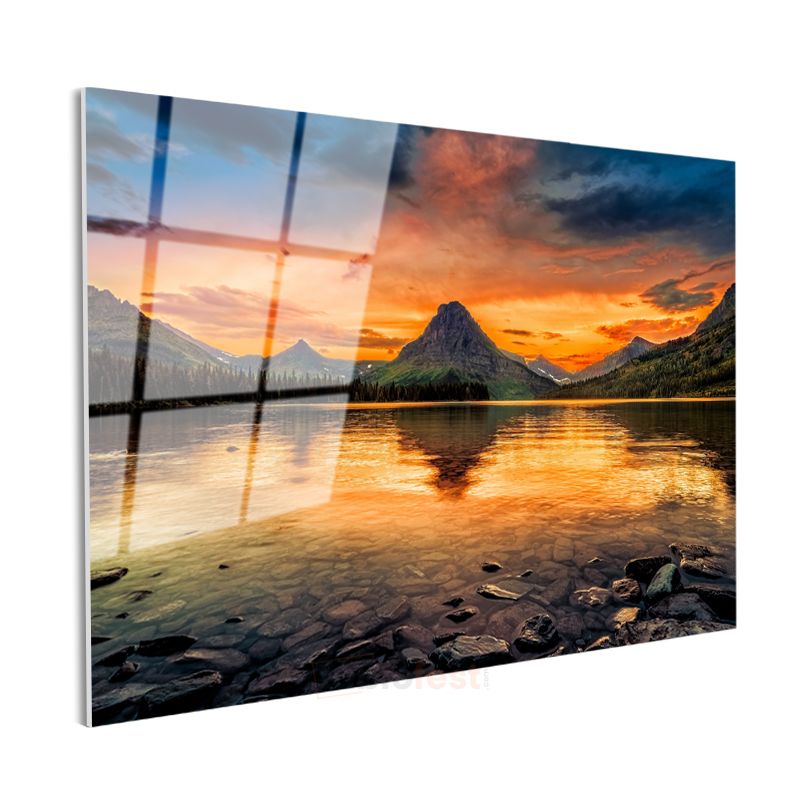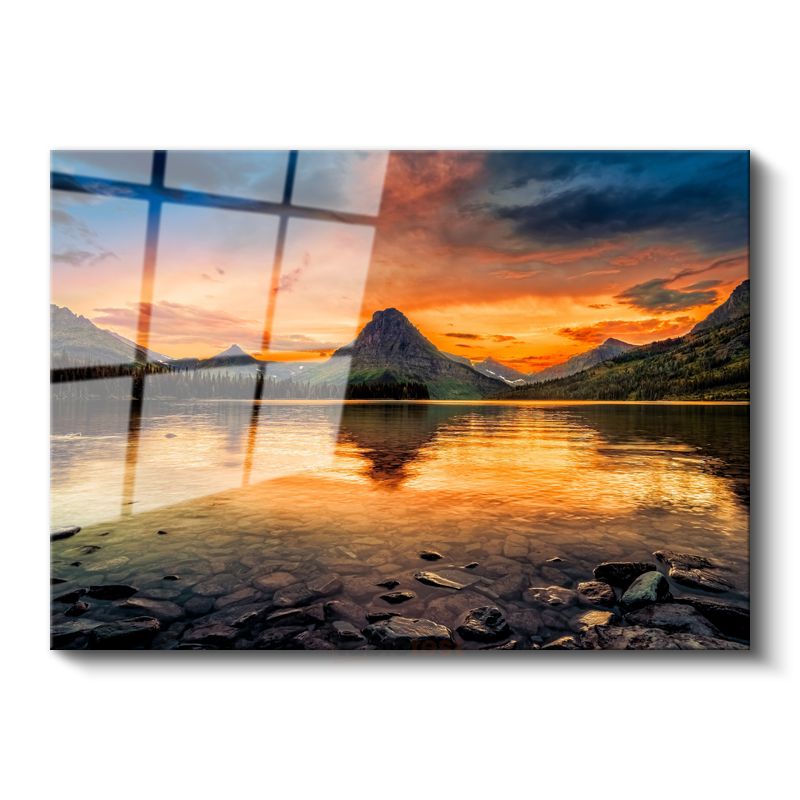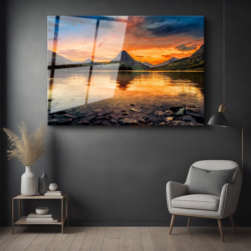 Alev Gökyüzü - Gün Batımında Dağ Silüetli Göl Manzarası Cam Tablo