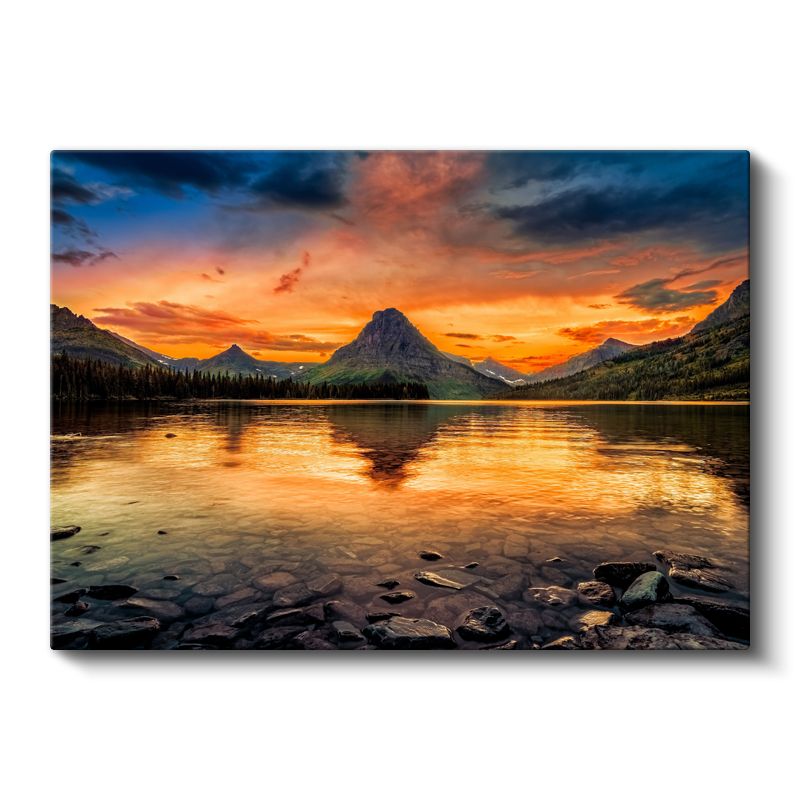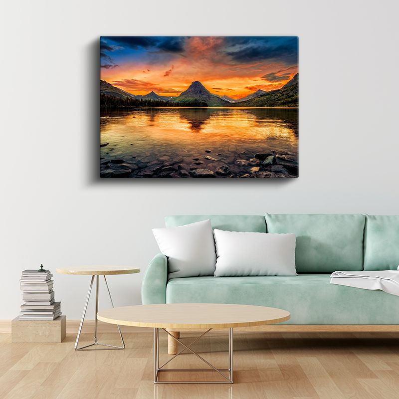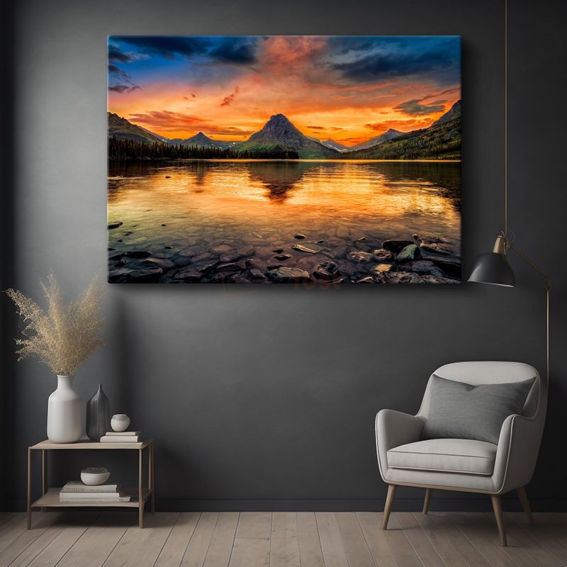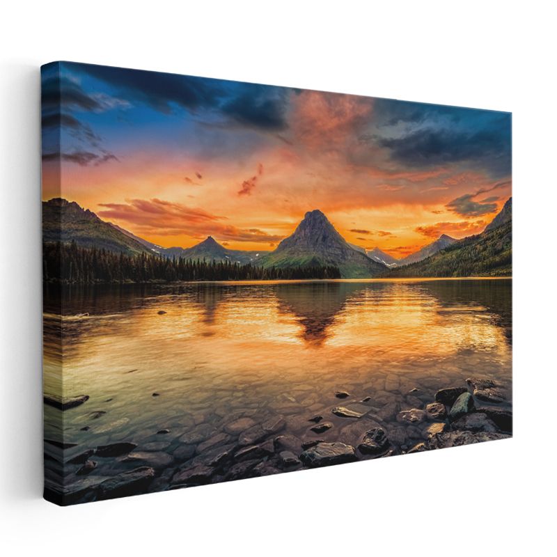 Alev Gökyüzü - Gün Batımında Dağ Silüetli Göl Manzarası Kanvas Tablo