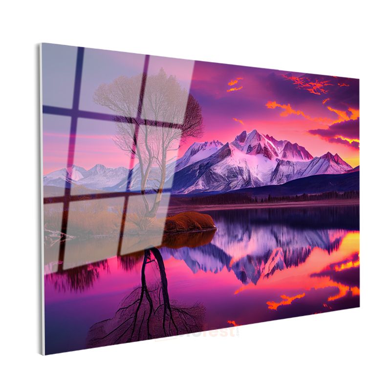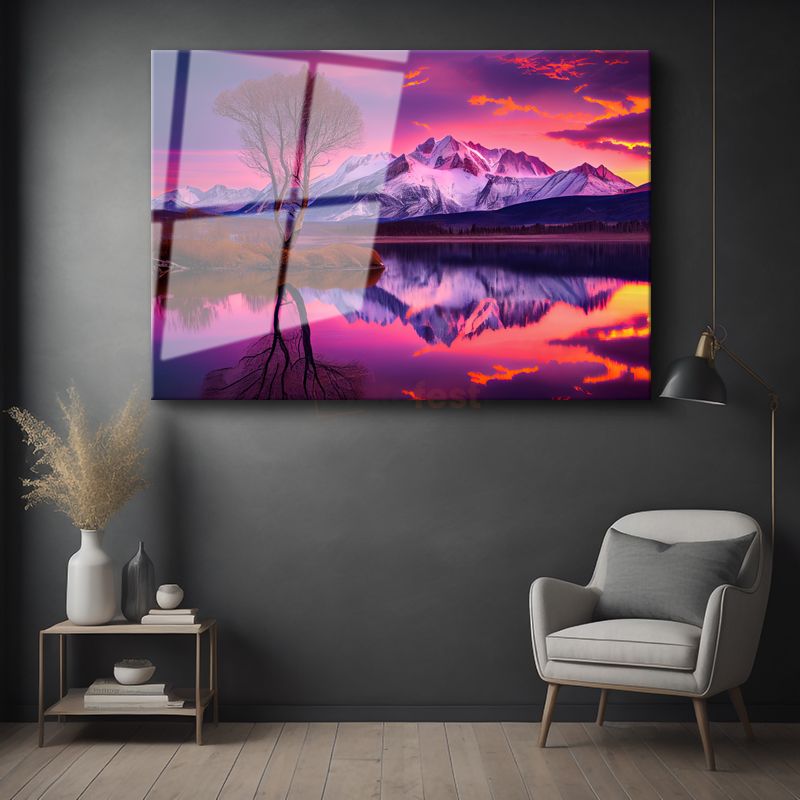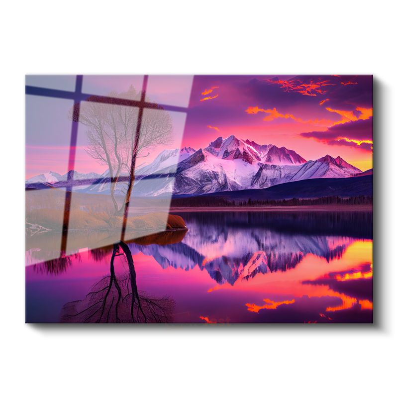 Alev Gökyüzü - Mor Tonlarda Gün Batımı ve Dağ Silüeti Cam Tablo