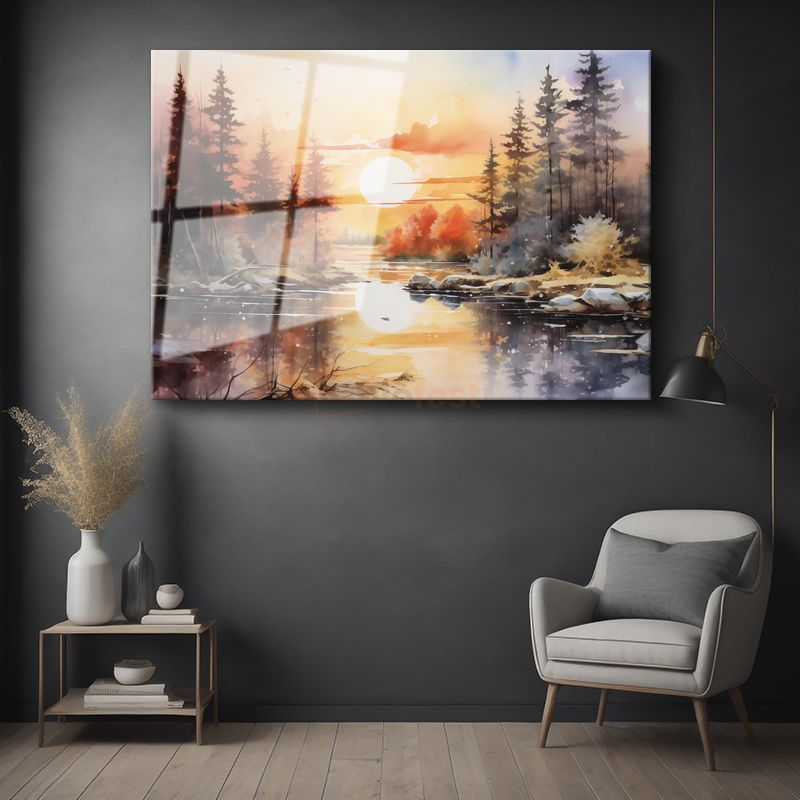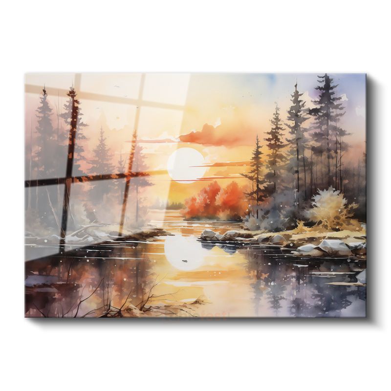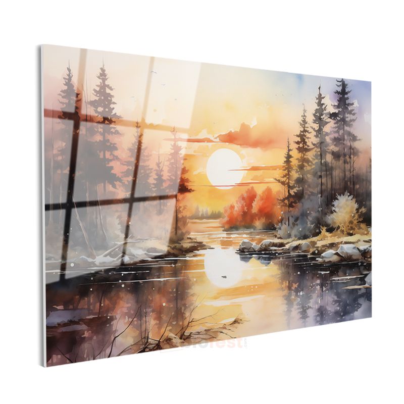 Alev Rengi Gün Batımı - Çam Ormanı ve Huzurlu Göl Yansıması Cam Tablo