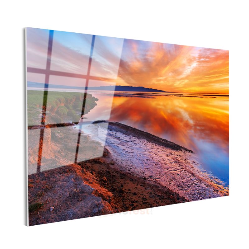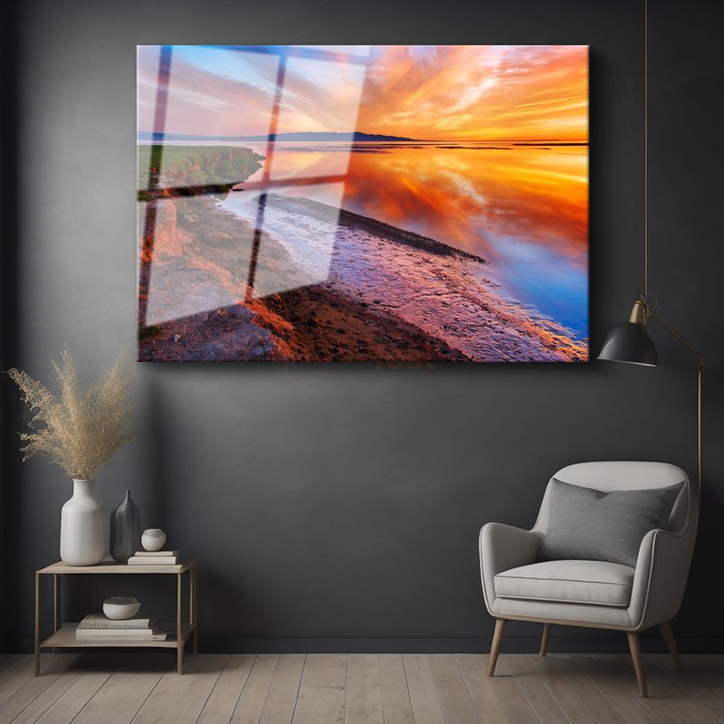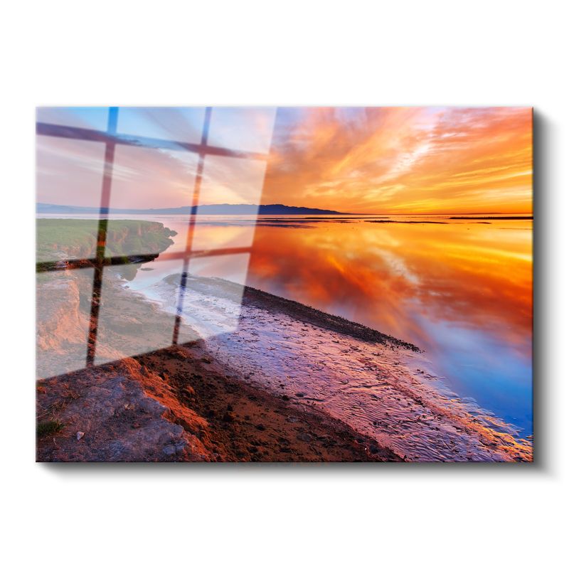 Alev Renkli Gün Batımı - Sahilde Altın Yansımalar Cam Tablo