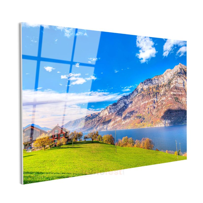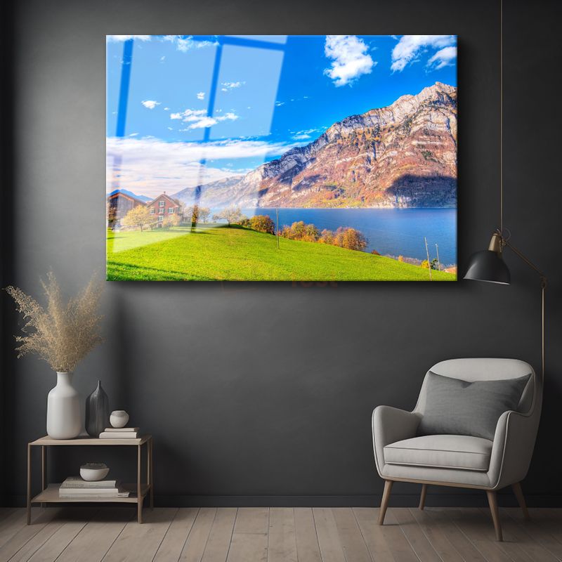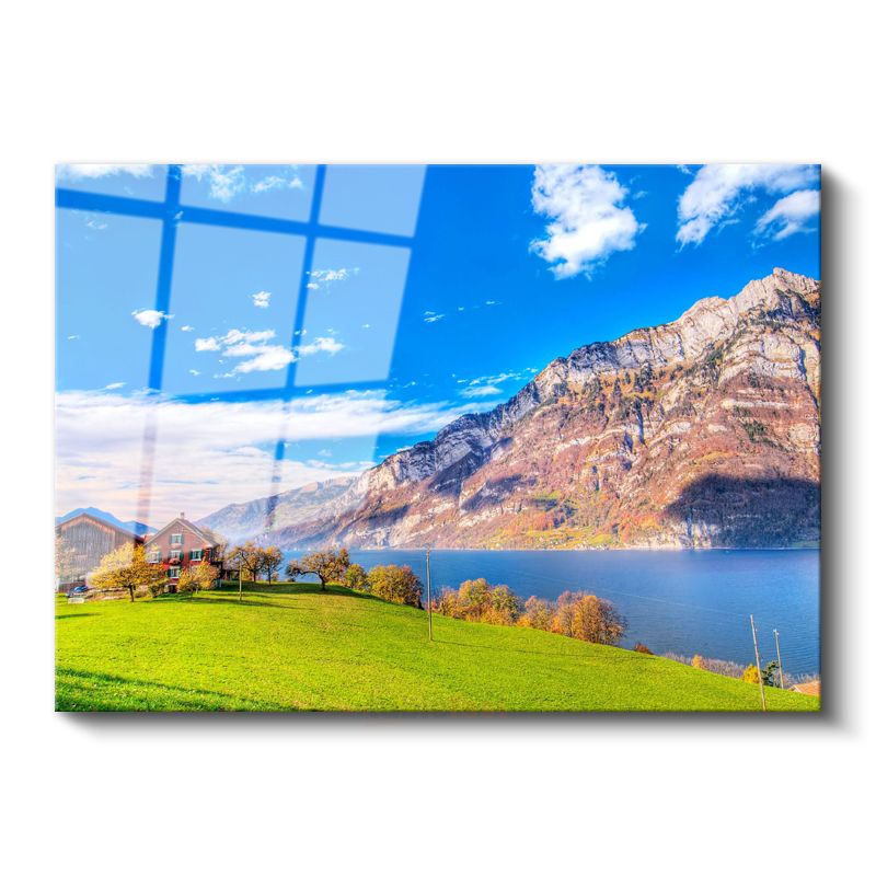 Alp Dağları - Göl Kenarında Huzur Dolu Yeşil Vadi Cam Tablo