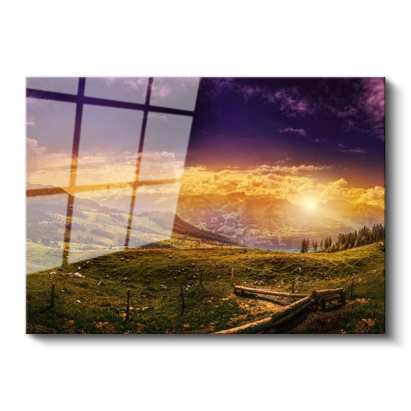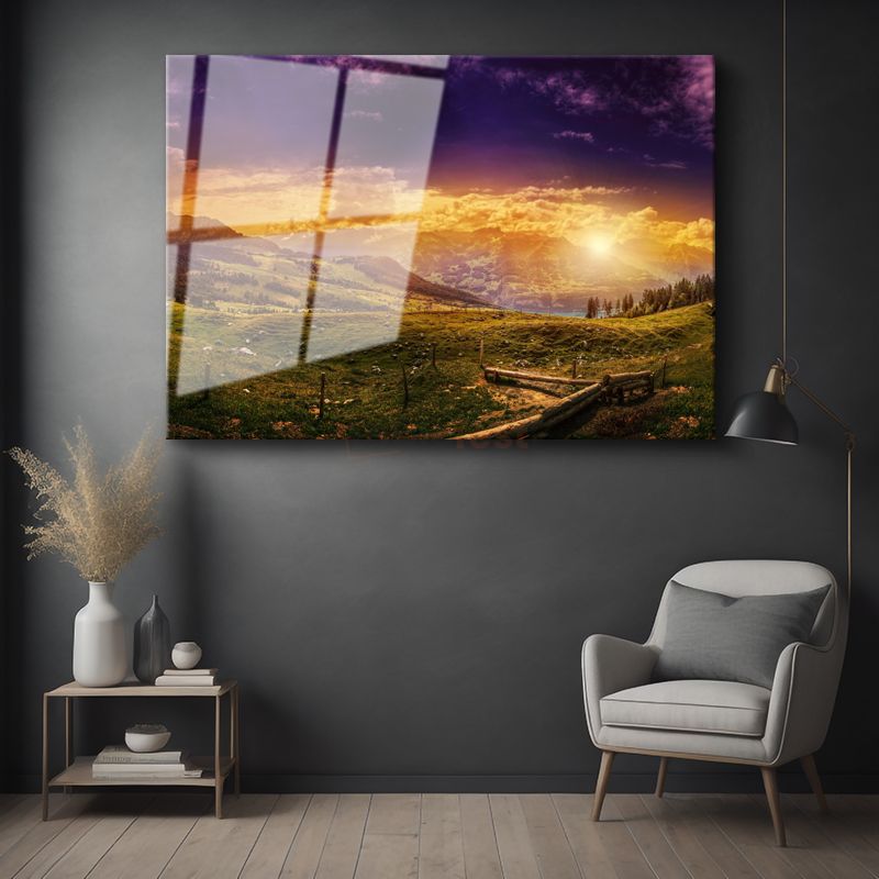 Alp Manzarası - Mor ve Altın Tonlarında Büyüleyici Gün Batımı Cam Tablo