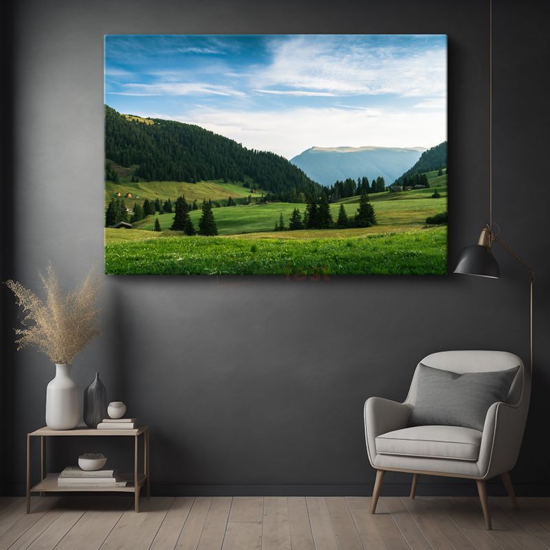 Alp Vadisi - Yemyeşil Çayırlar ve Dağ Silüetleri Kanvas Tablo