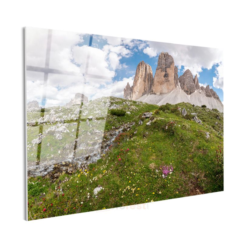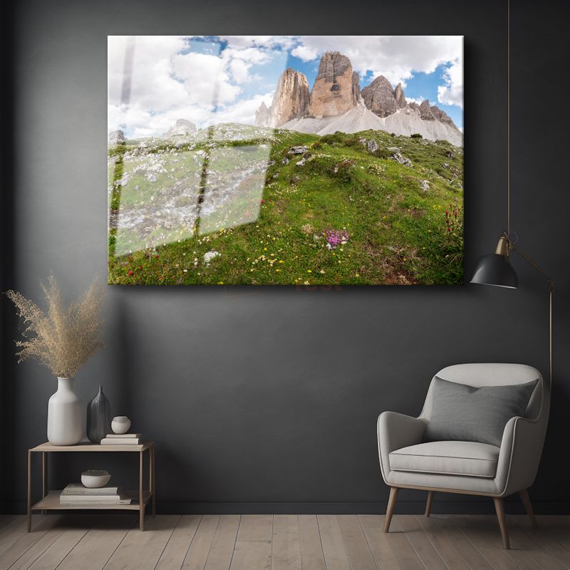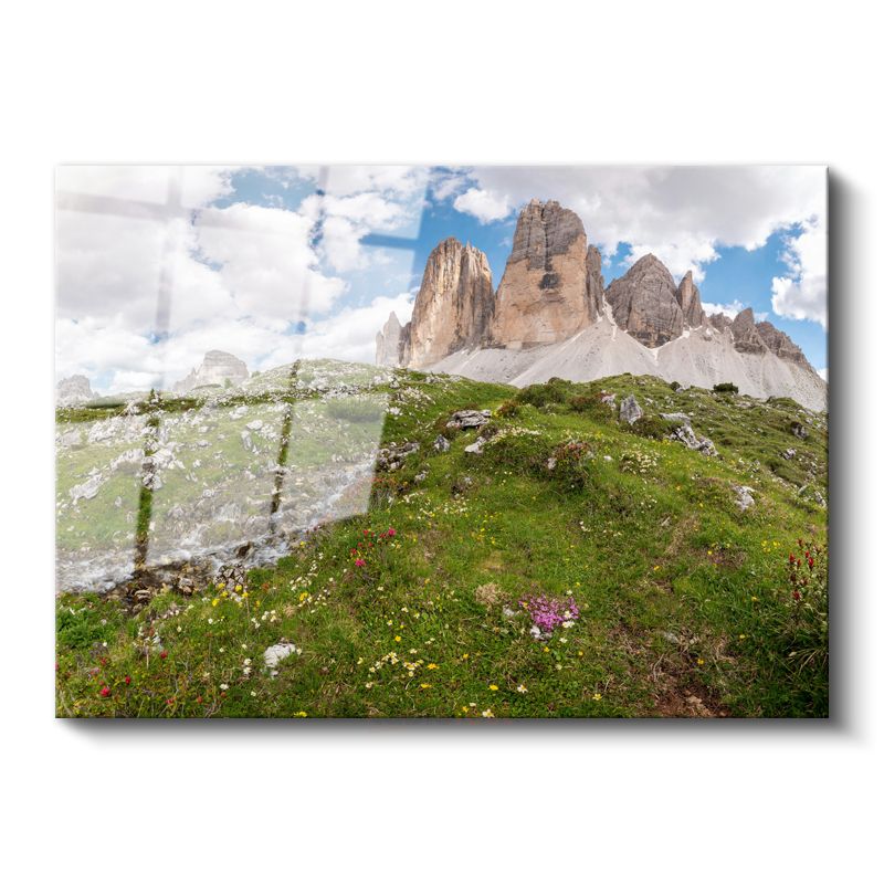 Alp Zirvesi - Çiçekli Çayırlar ve Görkemli Dağlar Cam Tablo