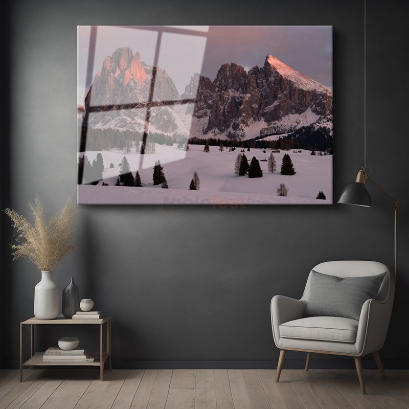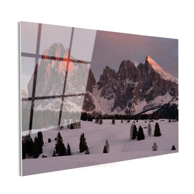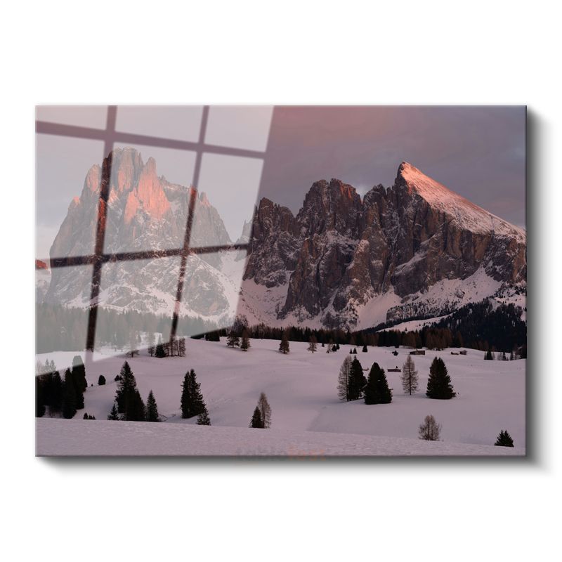 Alp Zirvesi - Gün Doğumunda Karlı Dağ Silsilesi Cam Tablo