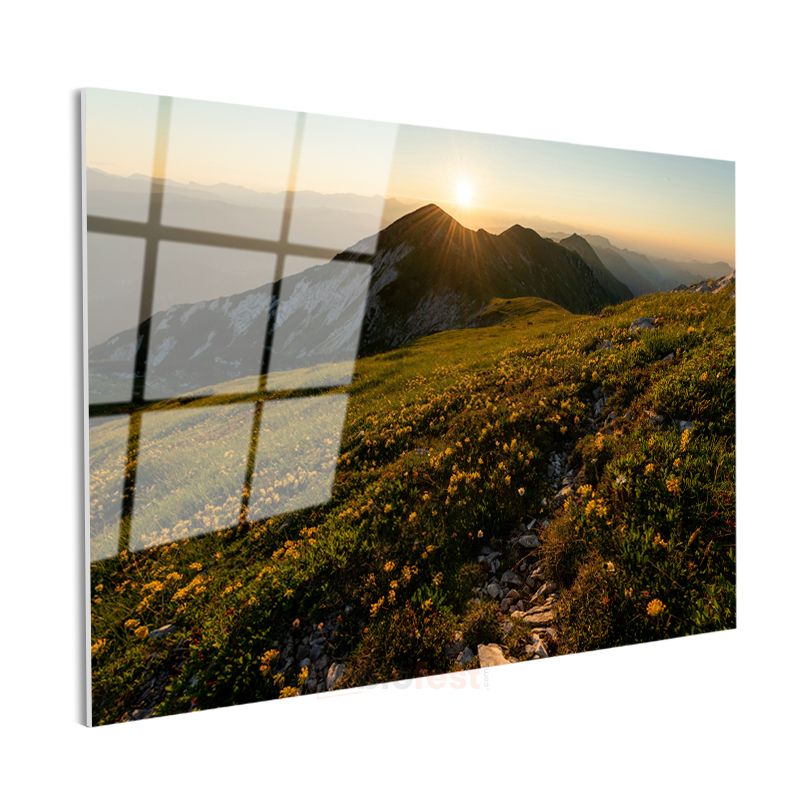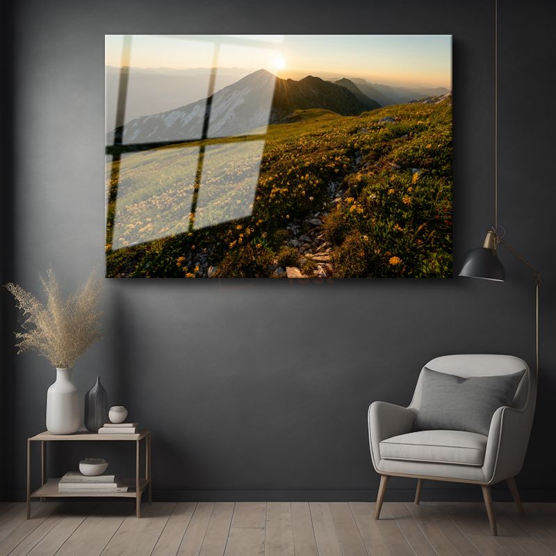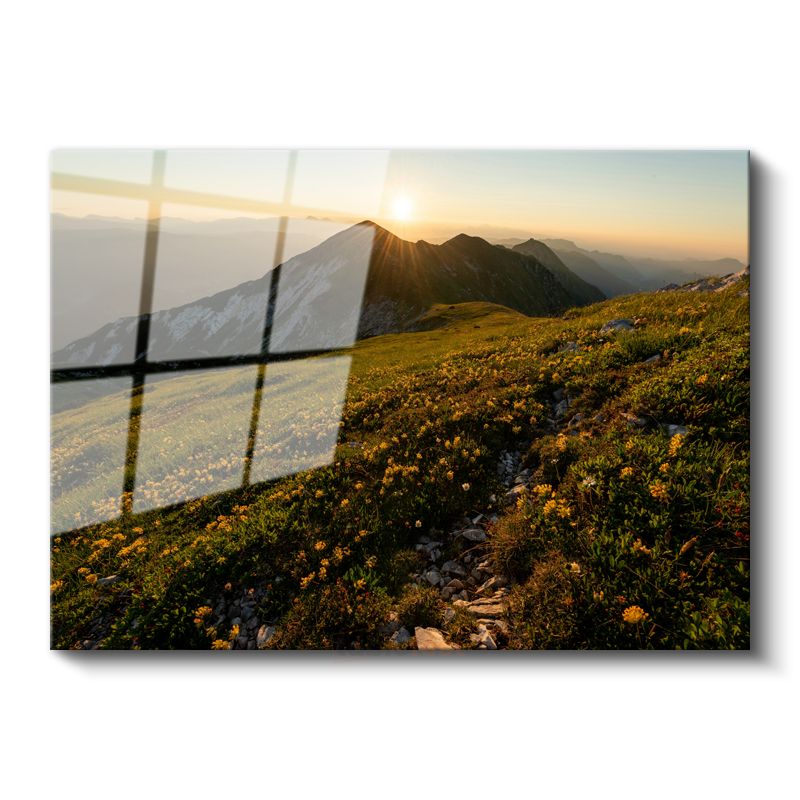 Alpin Çiçekleri - Dağ Zirvesinde Gün Batımı Cam Tablo