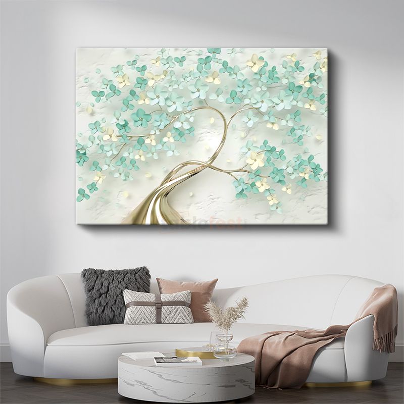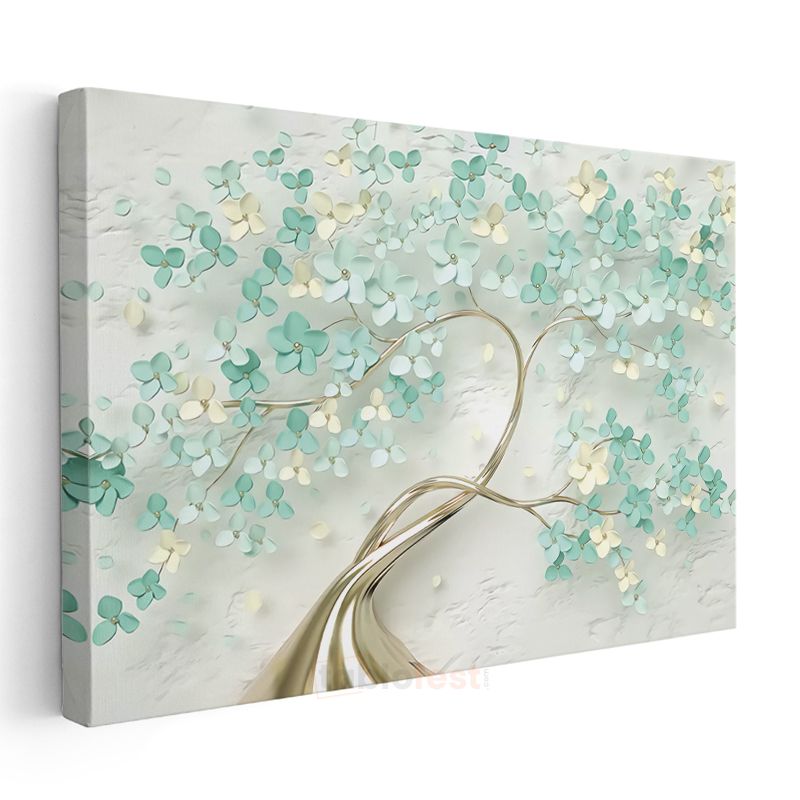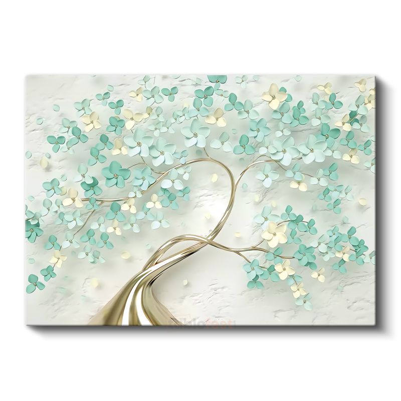 Altın Ağaç - Mint Yeşili Çiçeklerle Süslenmiş Dekoratif Tasarım Kanvas Tablo