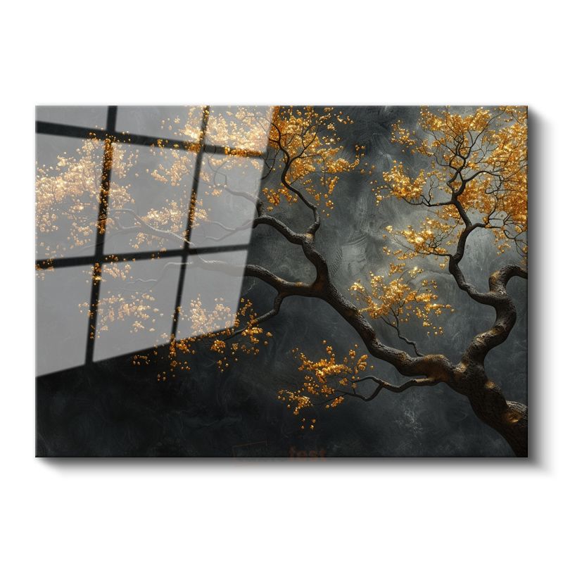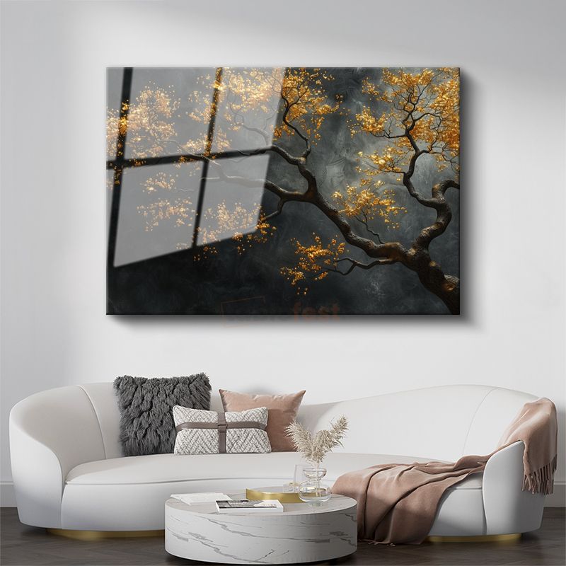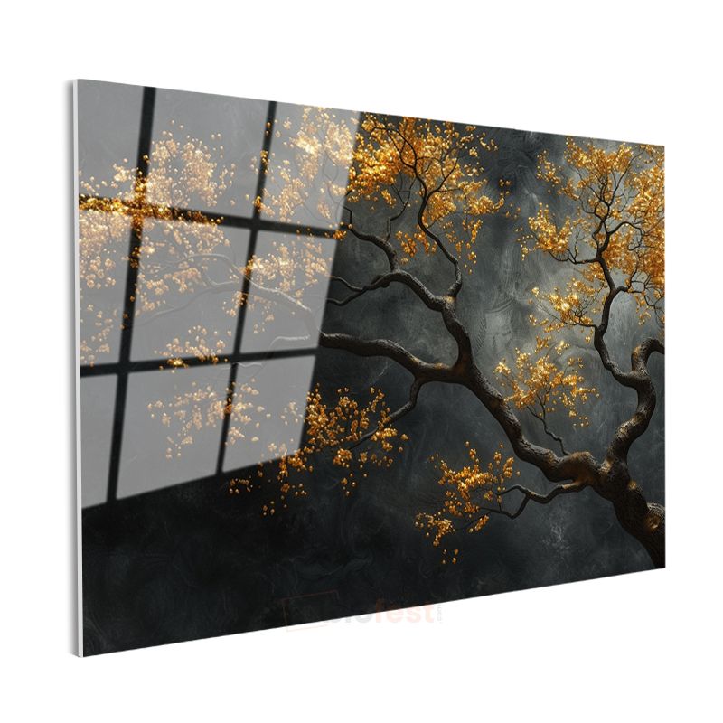 Altın Ağaç - Siyah Fonda Işıltılı Dekoratif Sanat Cam Tablo
