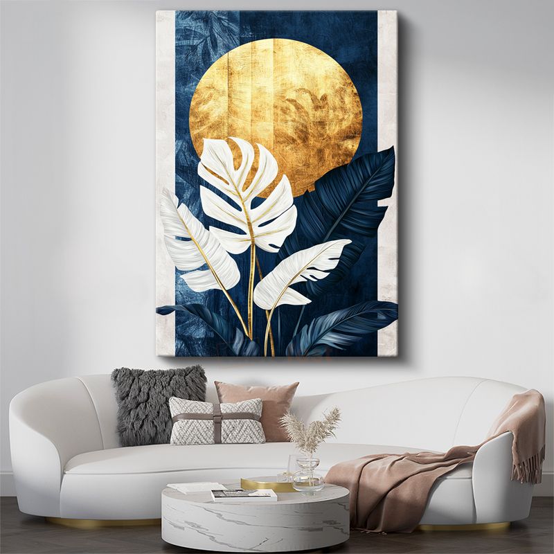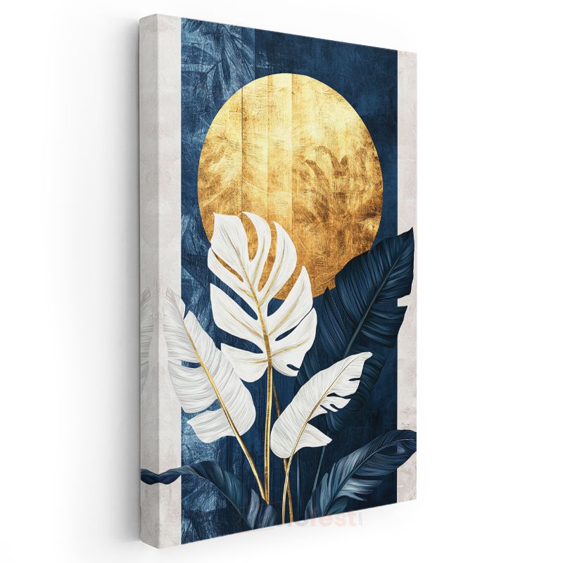 Altın Ay - Mavi Fonlu Beyaz Monstera Yaprakları Kanvas Tablo
