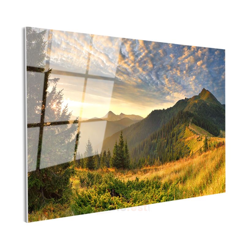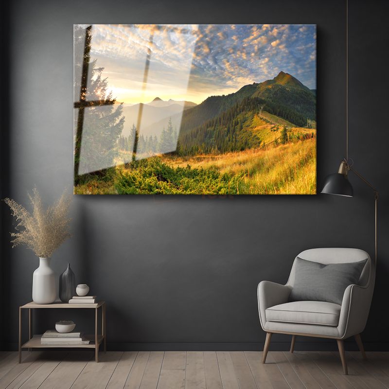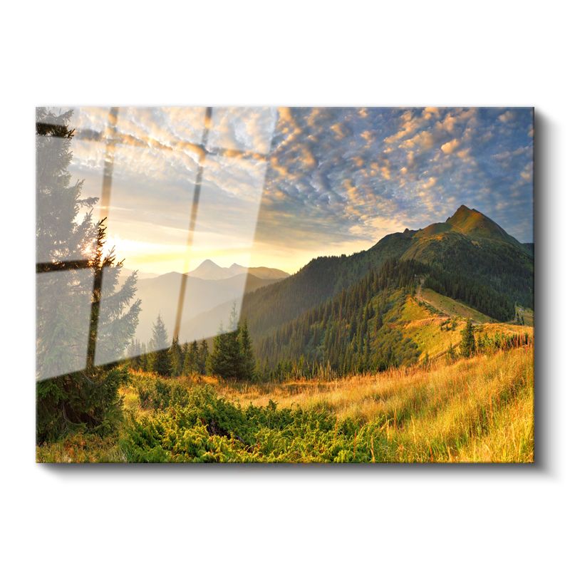 Altın Çayırlar - Gün Batımında Dağ Silüetleri Cam Tablo