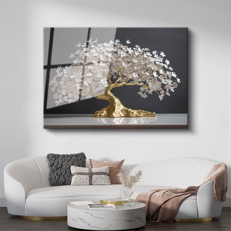 Altın Çiçek Ağacı - Zarif Beyaz Çiçekli Bonsai Sanatı Cam Tablo