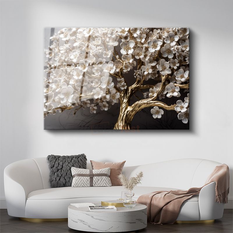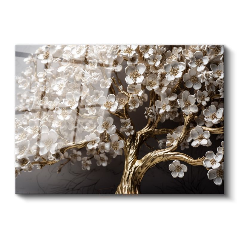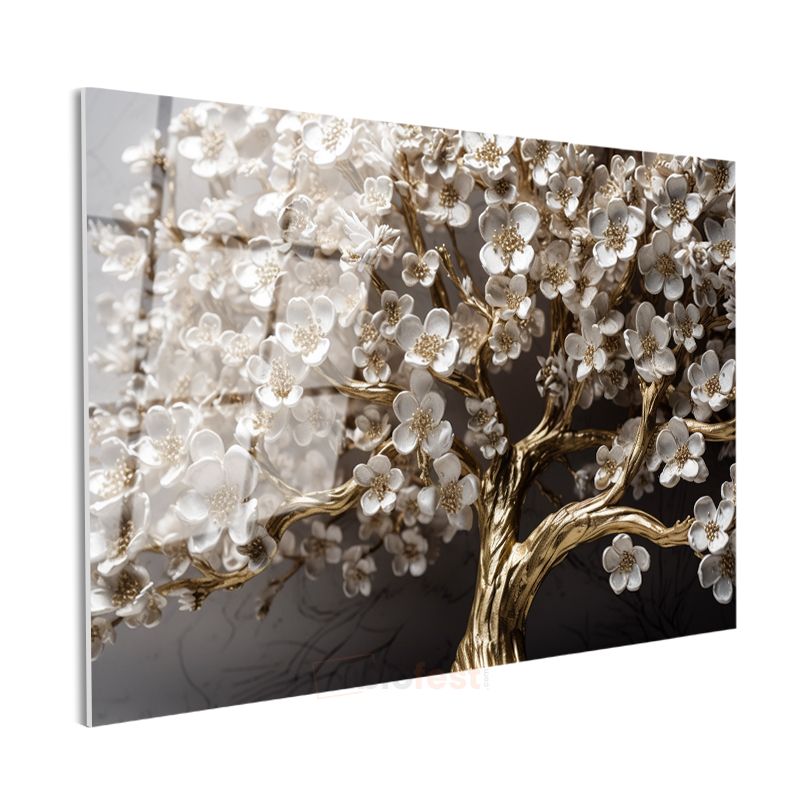 Altın Çiçek Ağacı - Zarif Beyaz Çiçekli Dekoratif Tasarım Cam Tablo