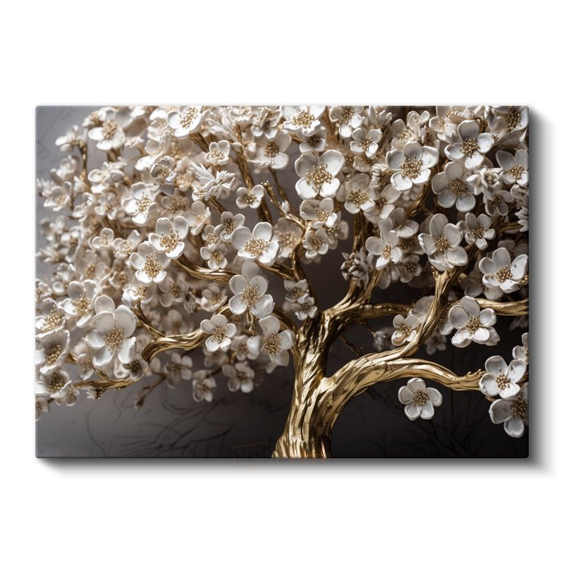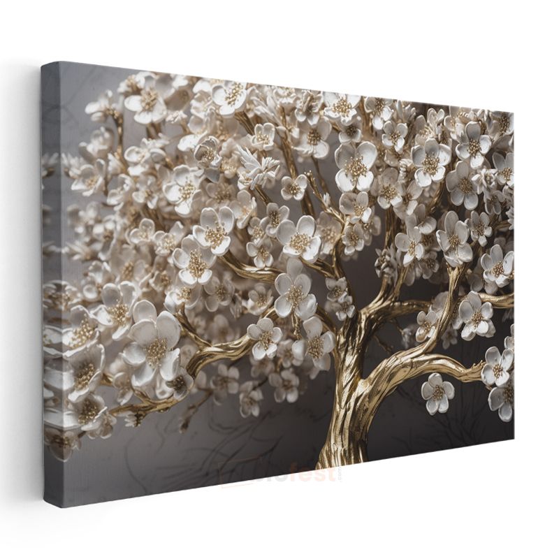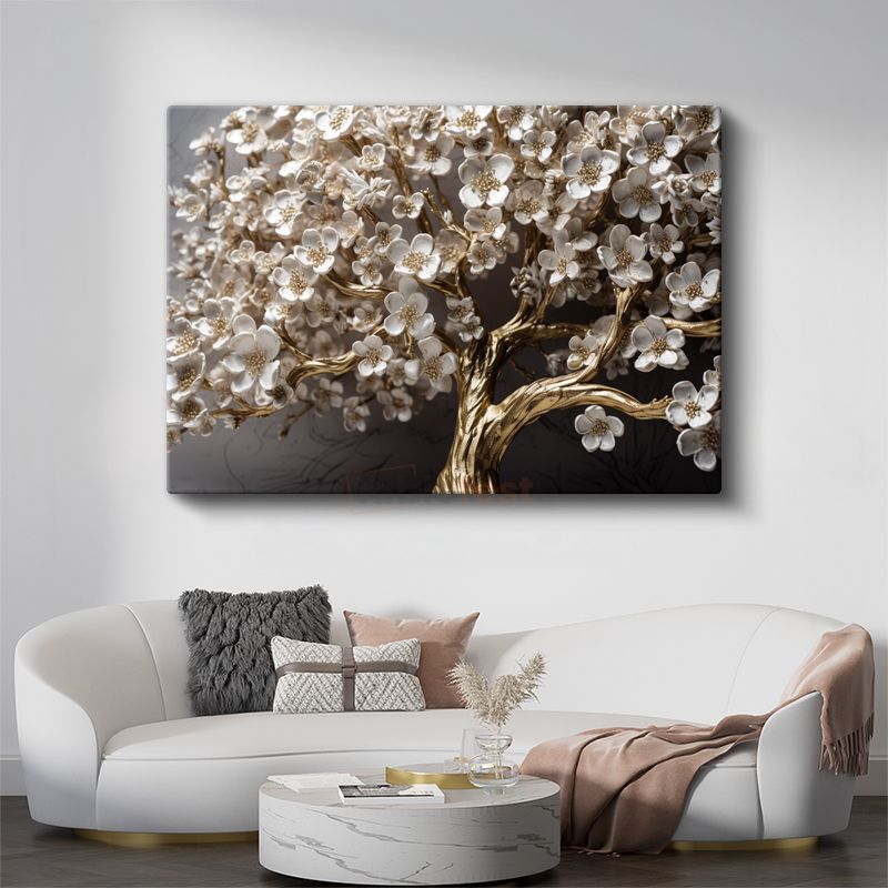 Altın Çiçek Ağacı - Zarif Beyaz Çiçekli Dekoratif Tasarım Kanvas Tablo