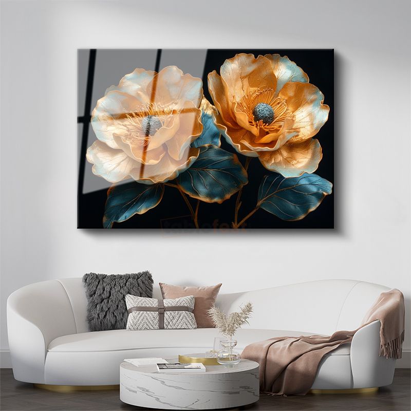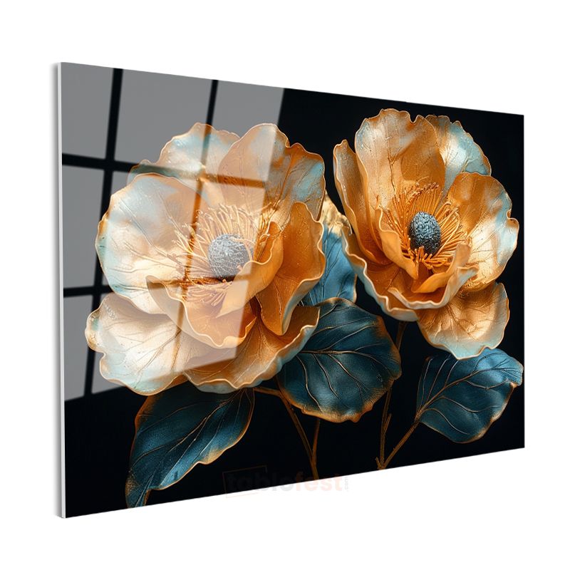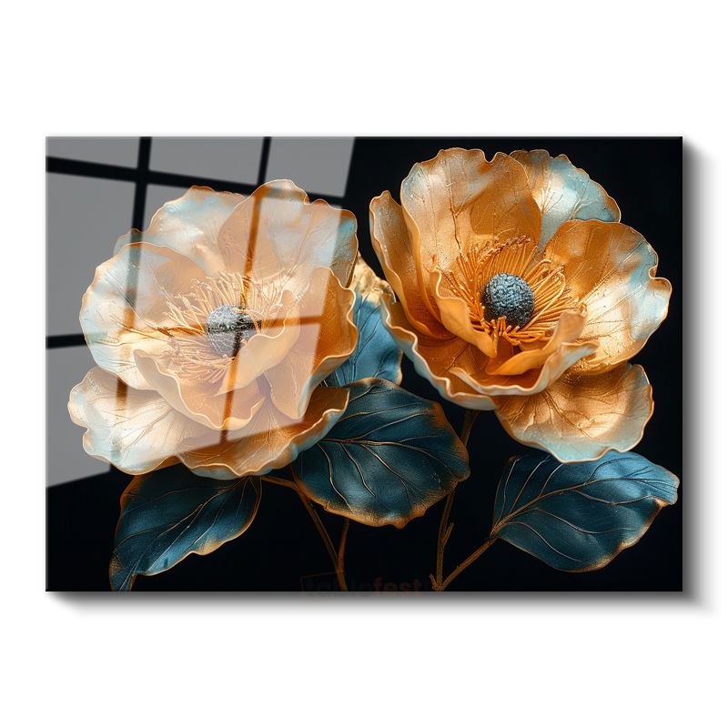 Altın Çiçekler - Turkuaz Yapraklı Metalik İkili Cam Tablo