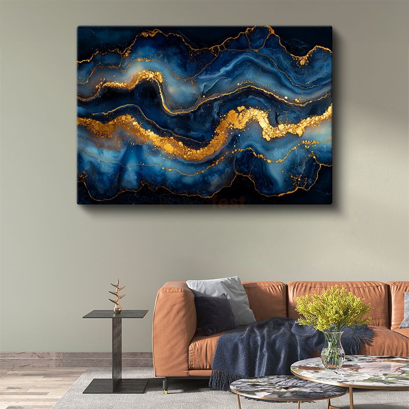Altın Dalgalar - Okyanus Mavisi Akışkan Sanat Kanvas Tablo