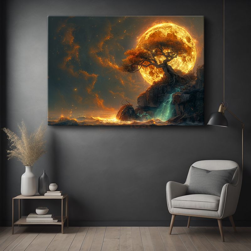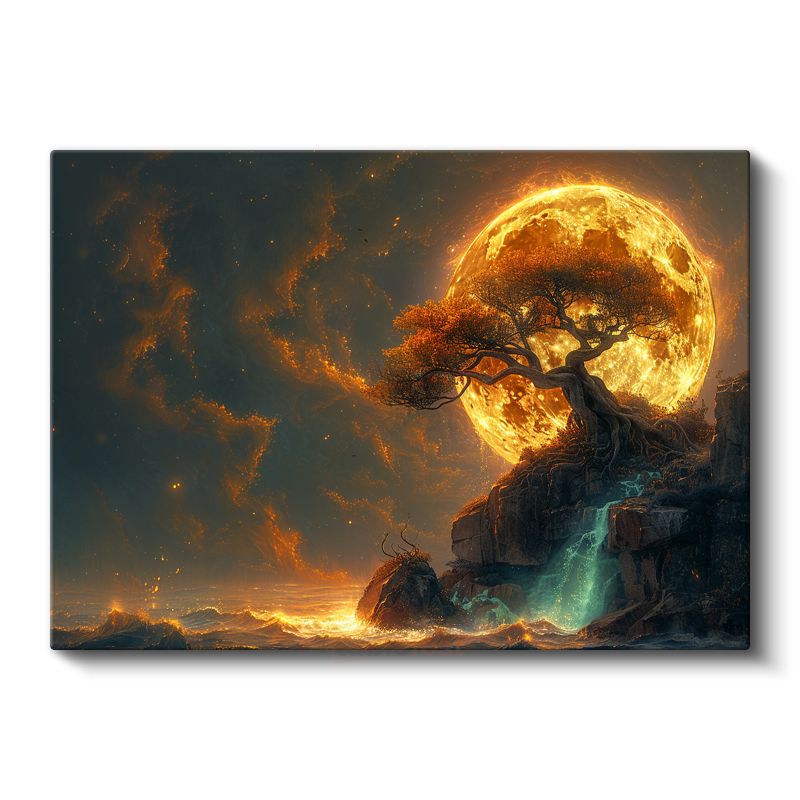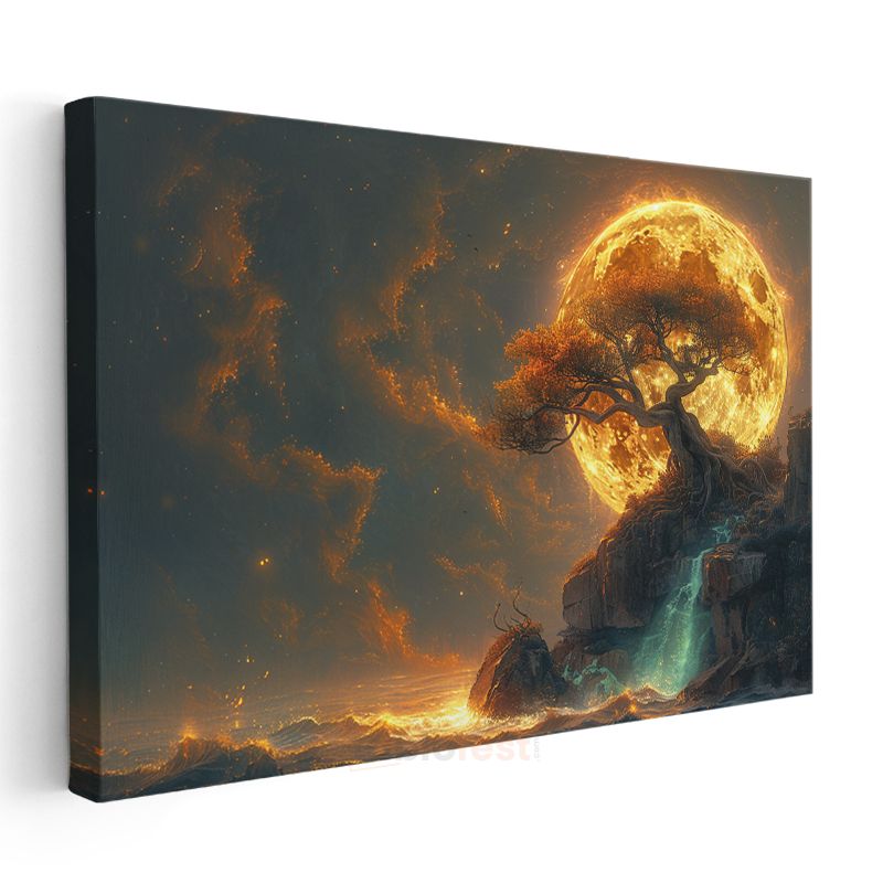 Altın Dolunay - Kayalıklarda Yükselen Kadim Ağaç Kanvas Tablo