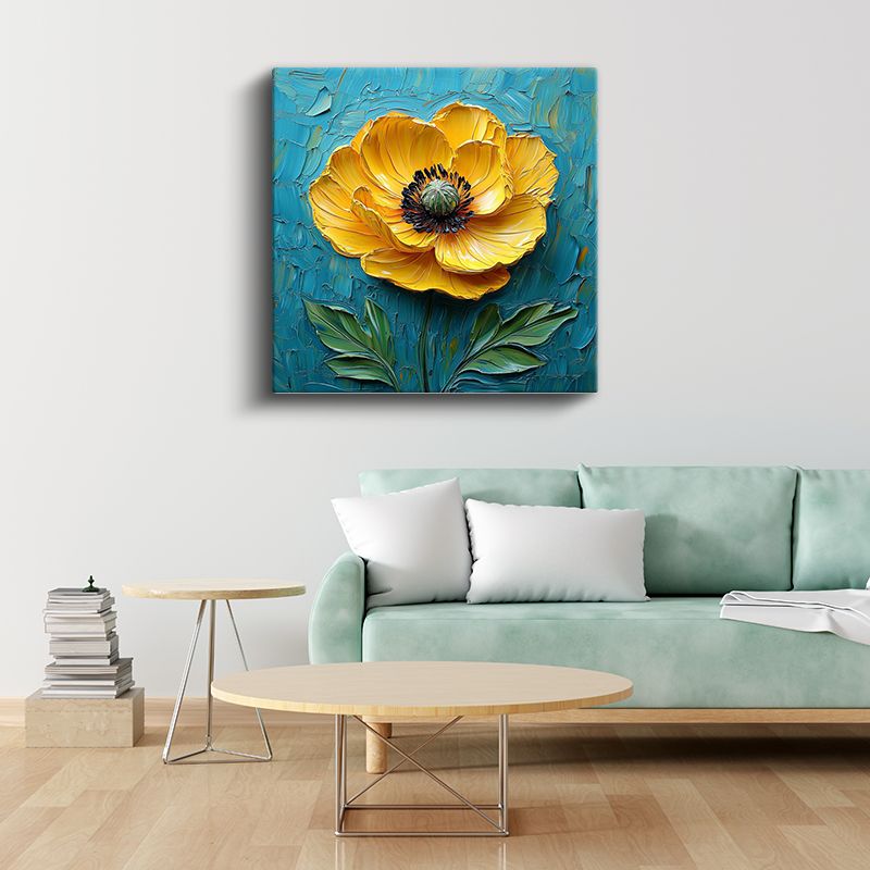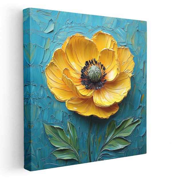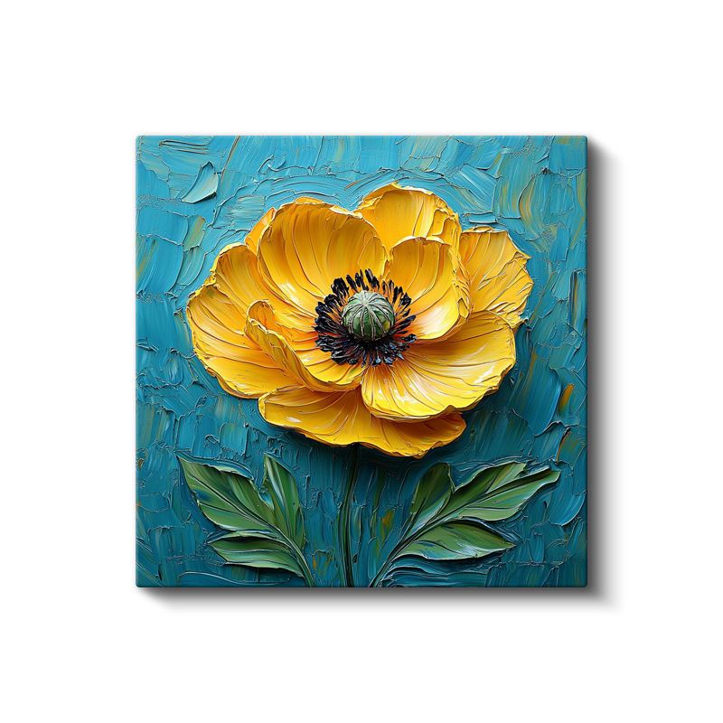 Altın Gelincik - Mavi Fonda İmpasto Tekniği Çiçek Kanvas Tablo