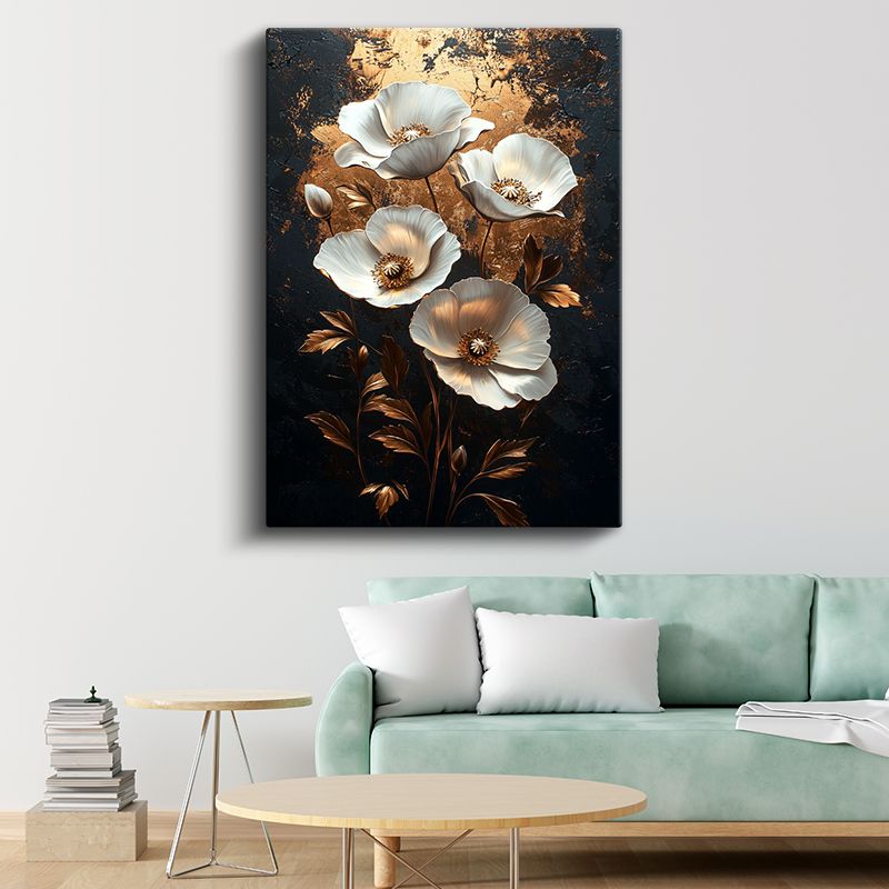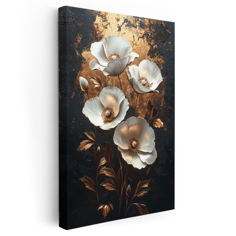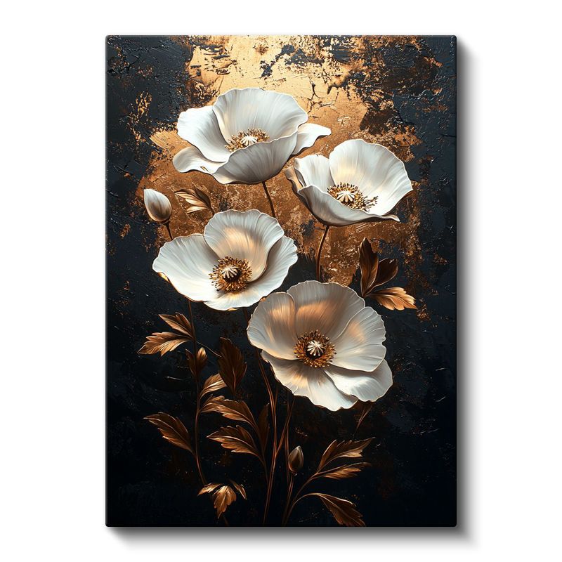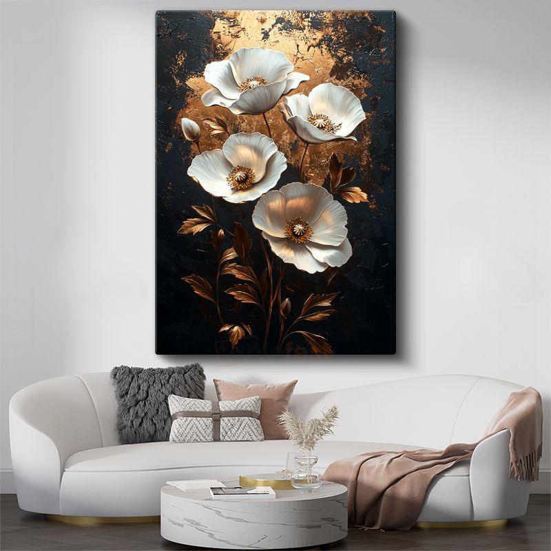 Altın Gelincikler - Lüks Siyah Zeminde Beyaz Çiçekler Kanvas Tablo