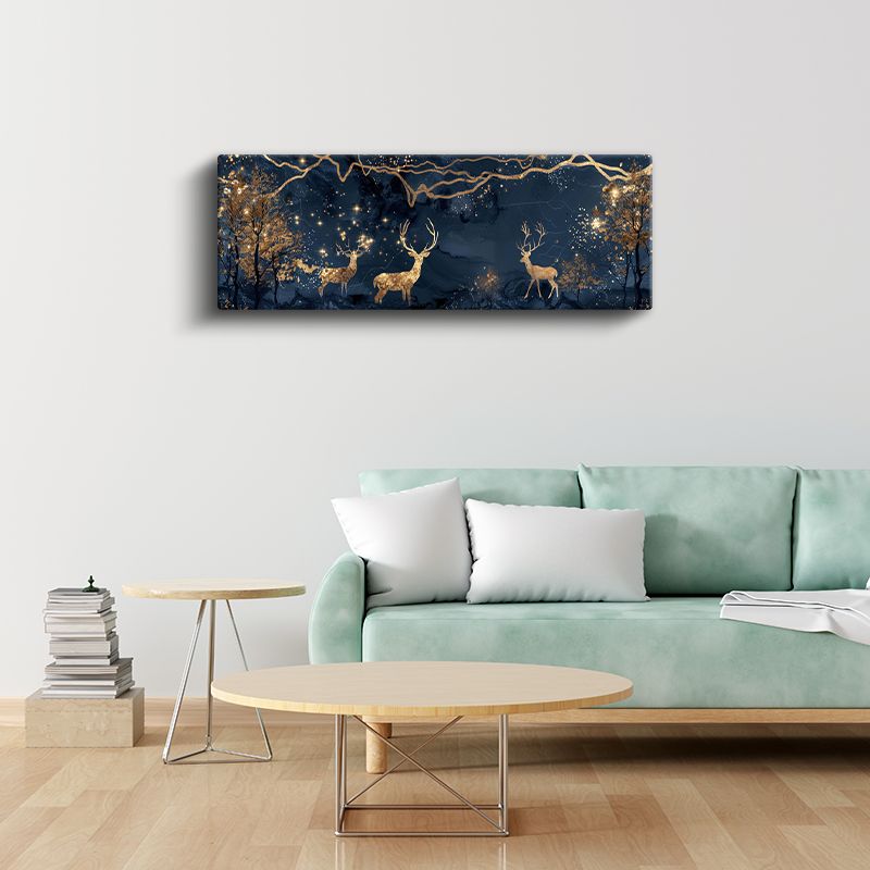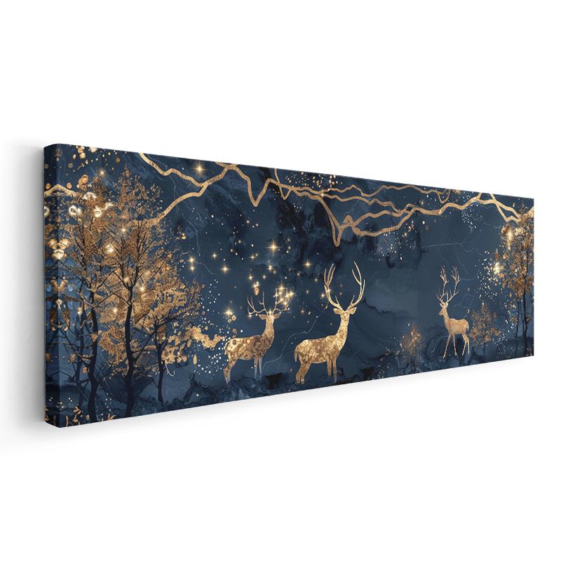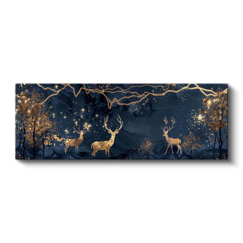 Altın Geyikler - Lacivert Gökyüzünde Parlayan Geyik Siluetleri Kanvas Tablo