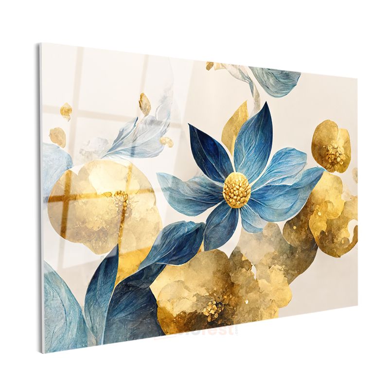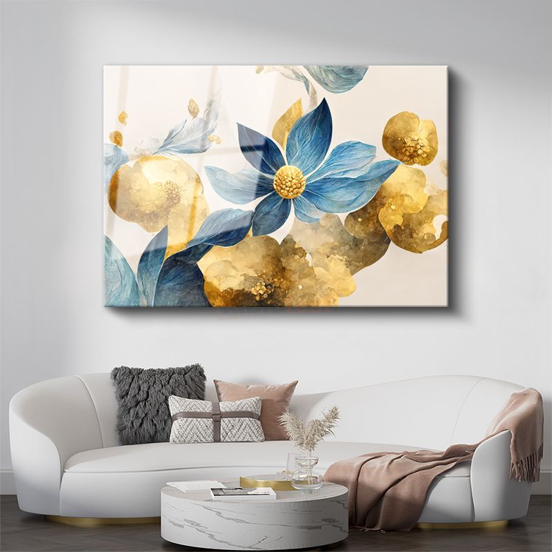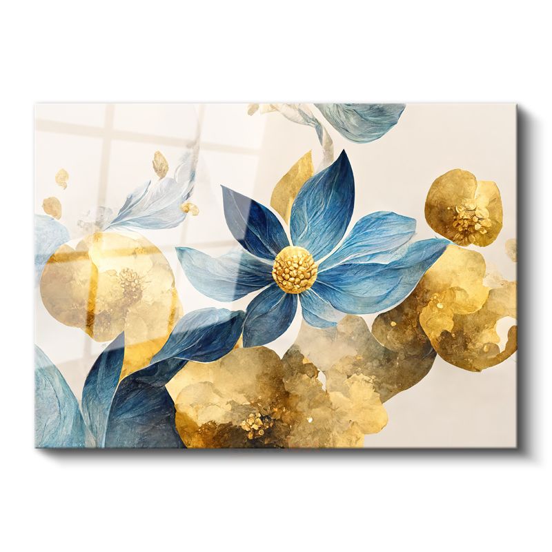 Altın Gri Çiçekler - Modern Çiçek Tasarımı Cam Tablo