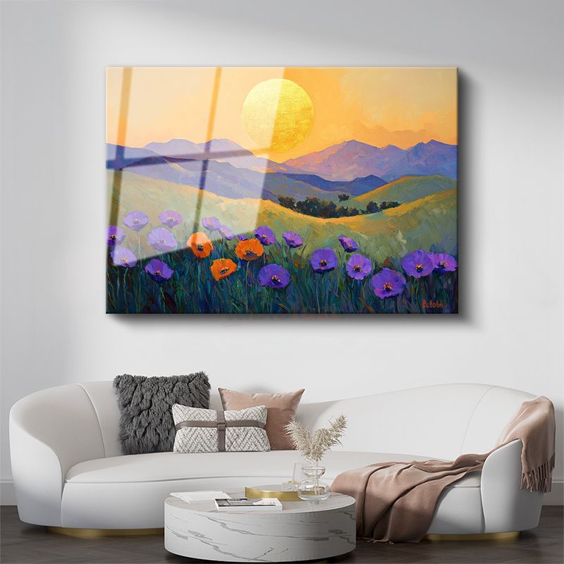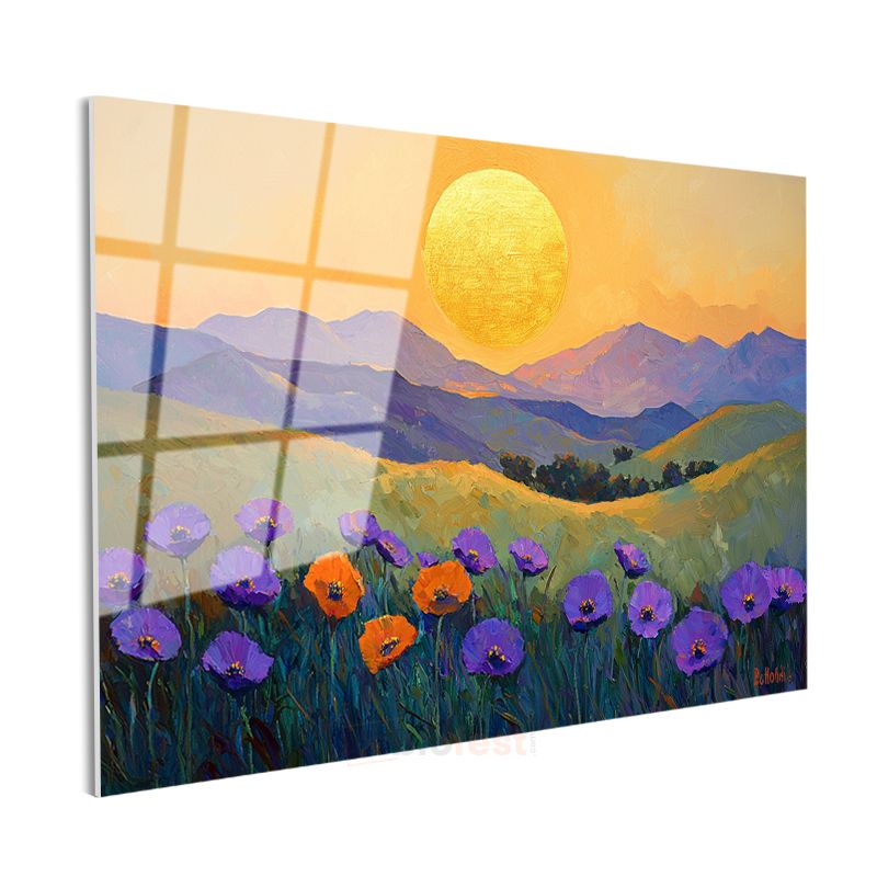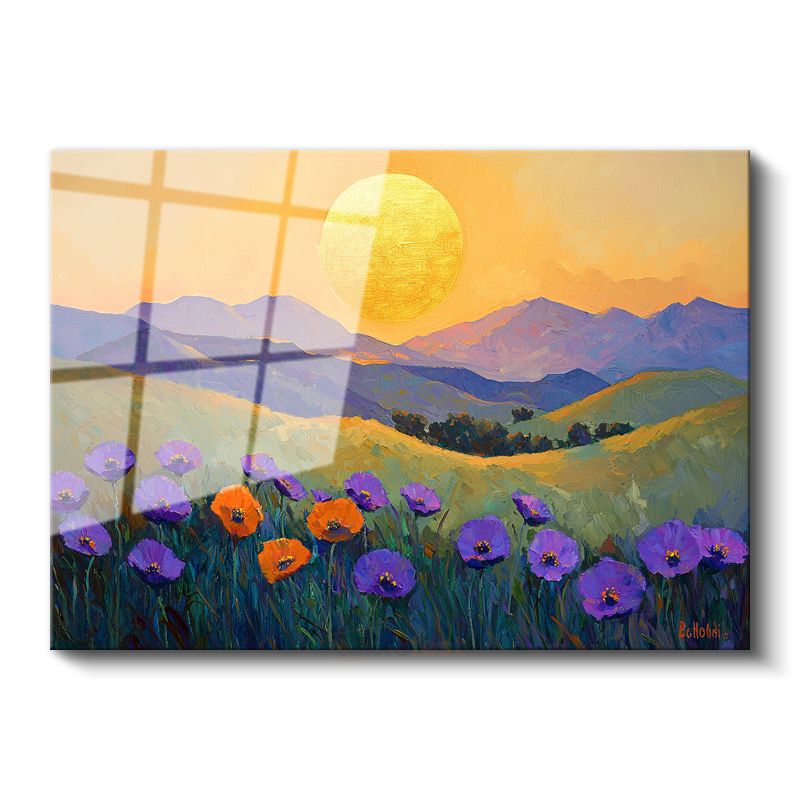 Altın Güneşli Gelincikler - Mor Çiçekli Dağ Manzarası Cam Tablo