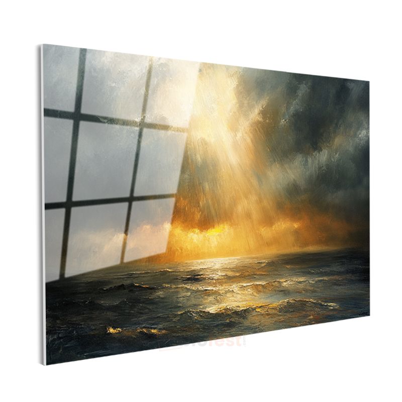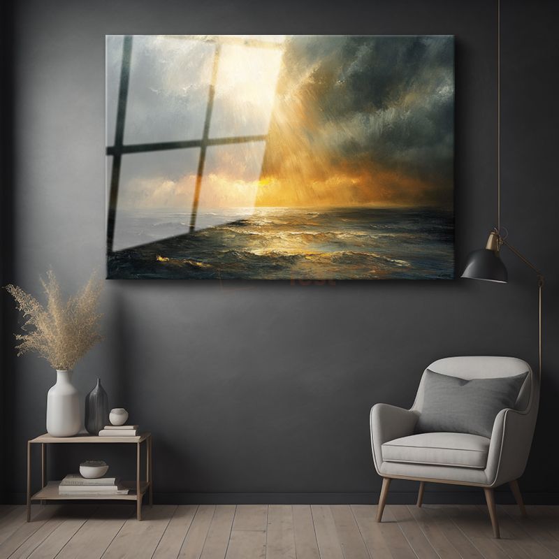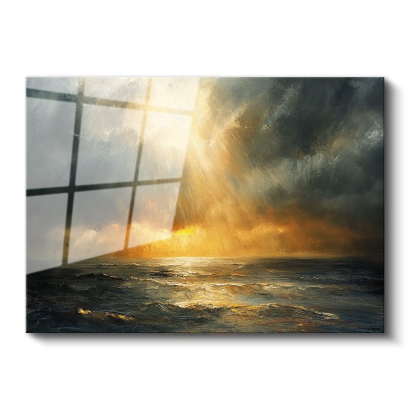 Altın Işınlar - Fırtınalı Deniz Üzerinde Güneş Huzmesi Cam Tablo