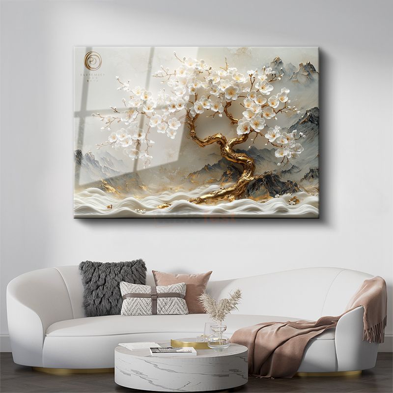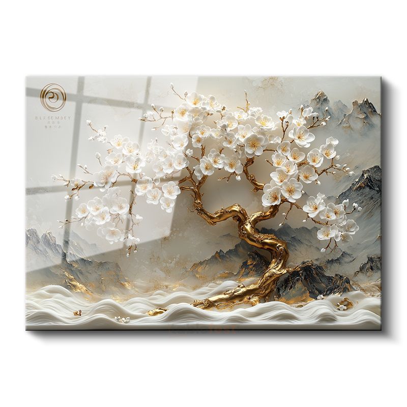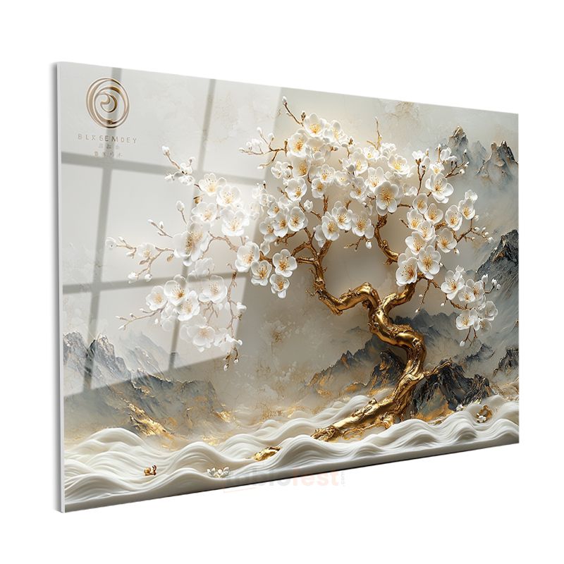 Altın Kiraz Çiçeği - Dağ Manzaralı Kabartma Görünümlü Sanat Cam Tablo