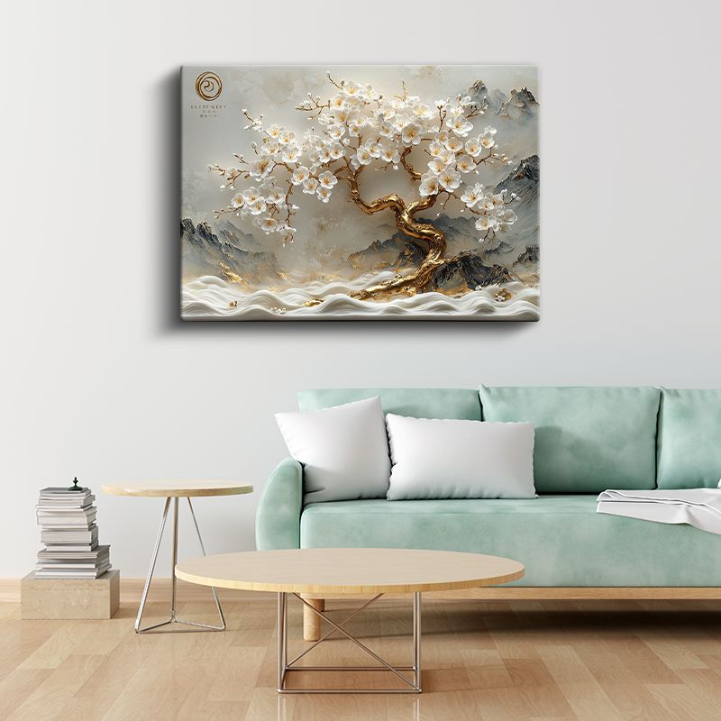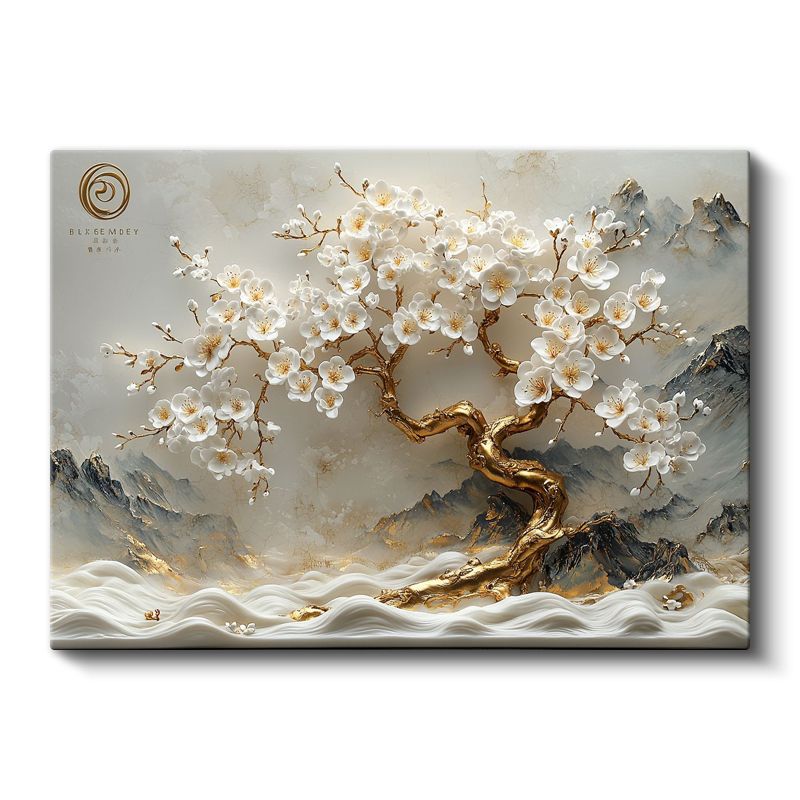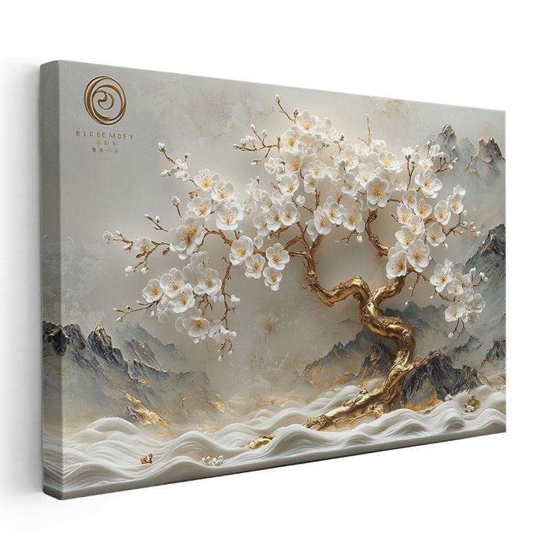 Altın Kiraz Çiçeği - Dağ Manzaralı Kabartma Görünümlü Sanat Kanvas Tablo
