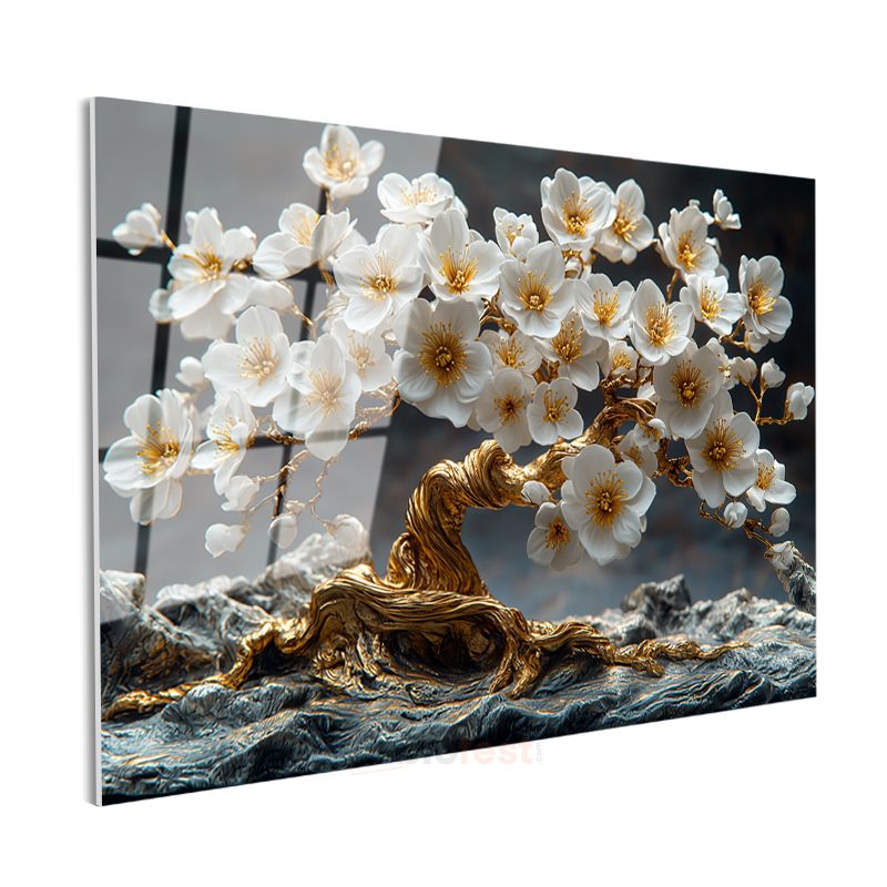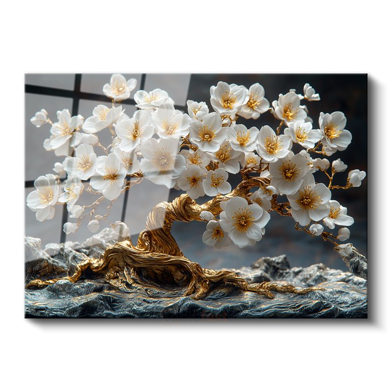 Altın Kiraz Çiçeği - Dekoratif Bonsai Ağacı Tasarımı Cam Tablo