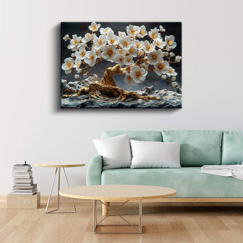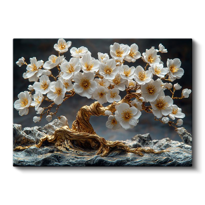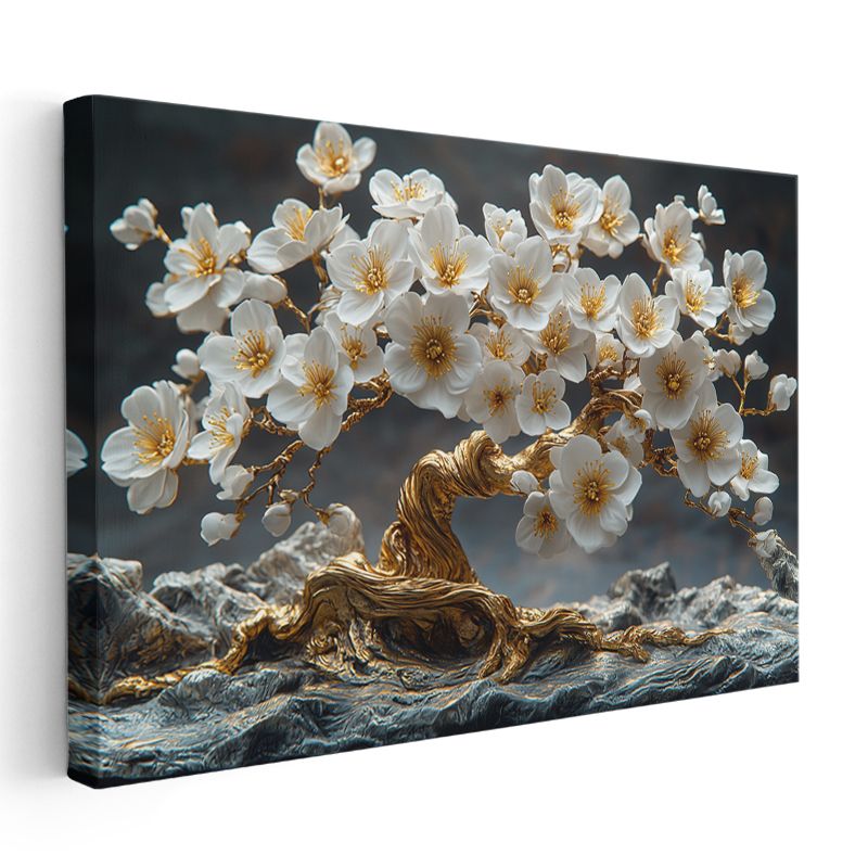 Altın Kiraz Çiçeği - Dekoratif Bonsai Ağacı Tasarımı Kanvas Tablo