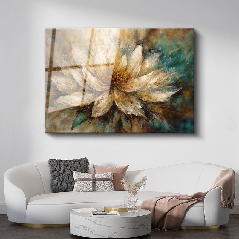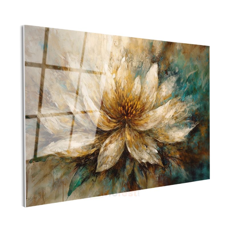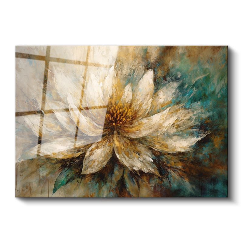 Altın Krem Nilüfer - Empresyonist Tarzda Çiçek Portresi Cam Tablo