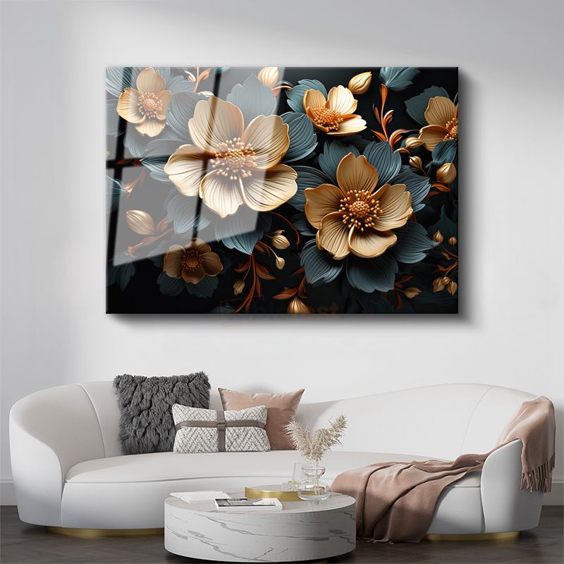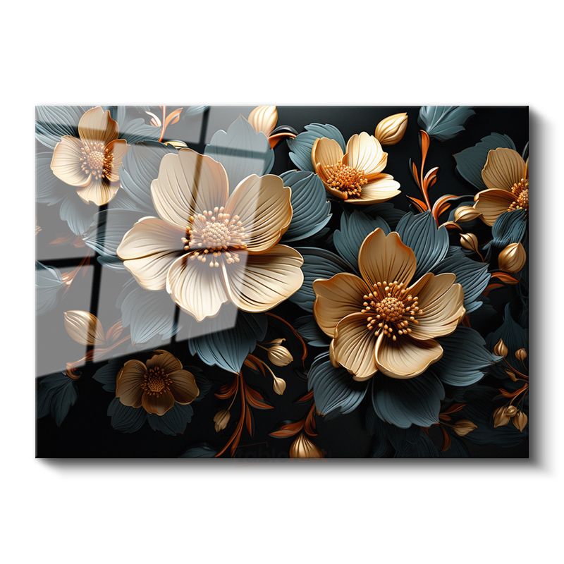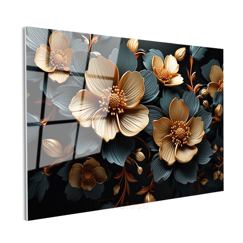 Altın Lotus - Siyah Fonda Lüks Çiçek Portresi Cam Tablo