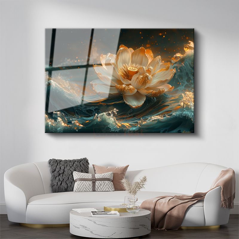 Altın Lotus - Su Üzerinde Işıltılı Nilüfer Çiçeği Cam Tablo