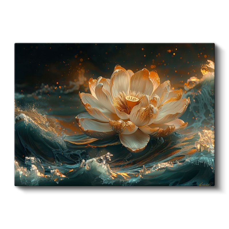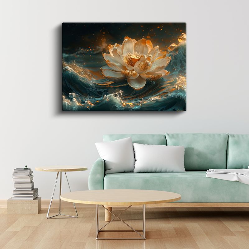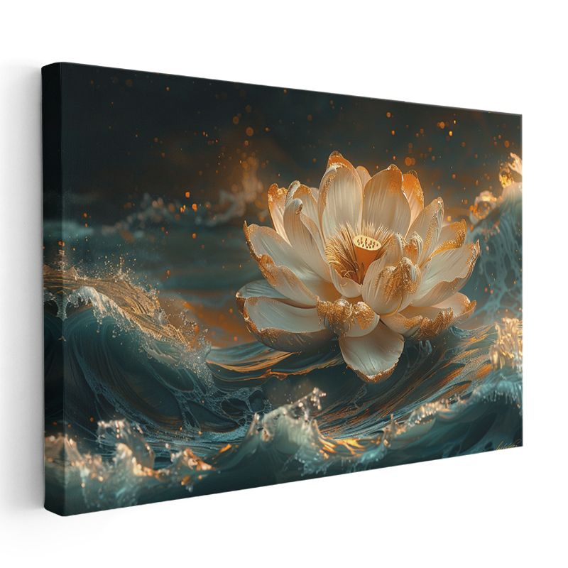 Altın Lotus - Su Üzerinde Işıltılı Nilüfer Çiçeği Kanvas Tablo